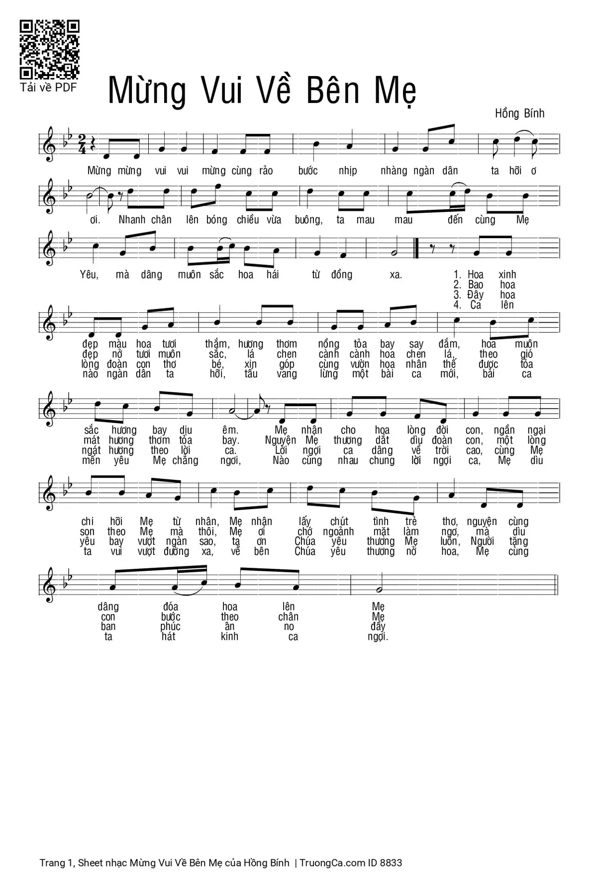 1. Hoa xinh đẹp màu hoa tươi thắm, hương thơm nồng tỏa bay say đắm, hoa muôn sắc hương bay dịu êm. Mẹ nhận cho hpa lòng đời con, ngần ngại chi hỡi Mẹ từ nhân. Mẹ nhận lấy chút tình trẻ thơ, nguyện cùng dâng đóa hoa lên Mẹ.