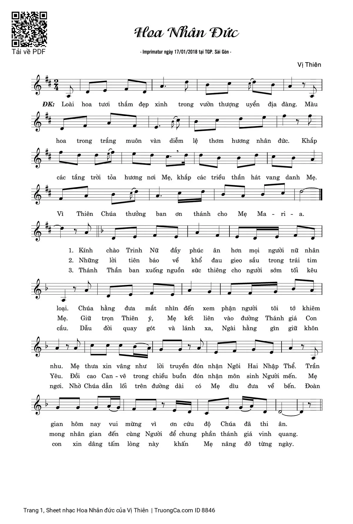 Chọn nút dấu + để tăng tông lên nửa cung, nút dấu - để giảm tông xuống nửa cung. Rê chuột vào hợp âm để xem các thế bấm hợp âm của bài hát Hoa Nhân đức.