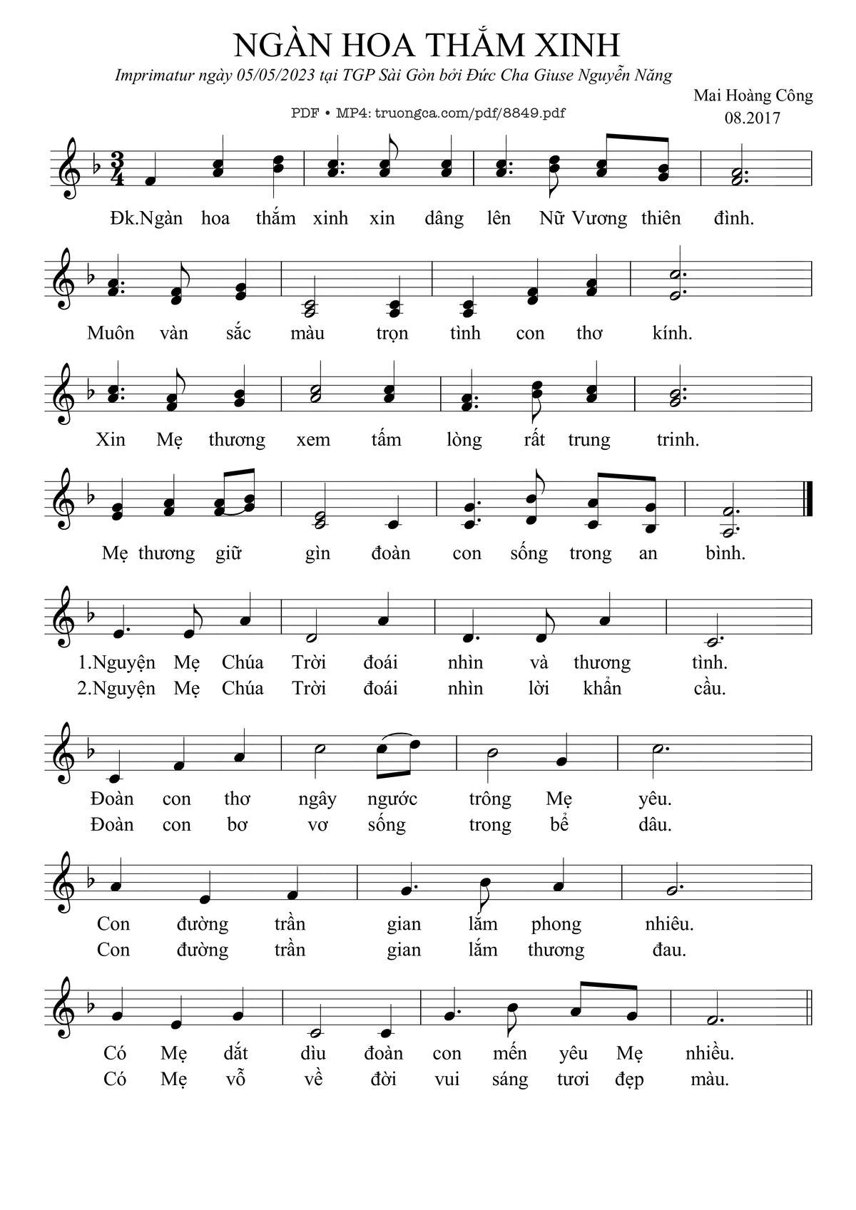 Điệp khúc. Ngàn hoa thắm xinh xin dâng lên Nữ Vương thiên đình. Muôn vàn sắc màu trọn tình con thơ kính. Xin Mẹ thương xem tấm lòng rất trung trinh. Mẹ thương giữ gìn đoàn con sống trong an bình.