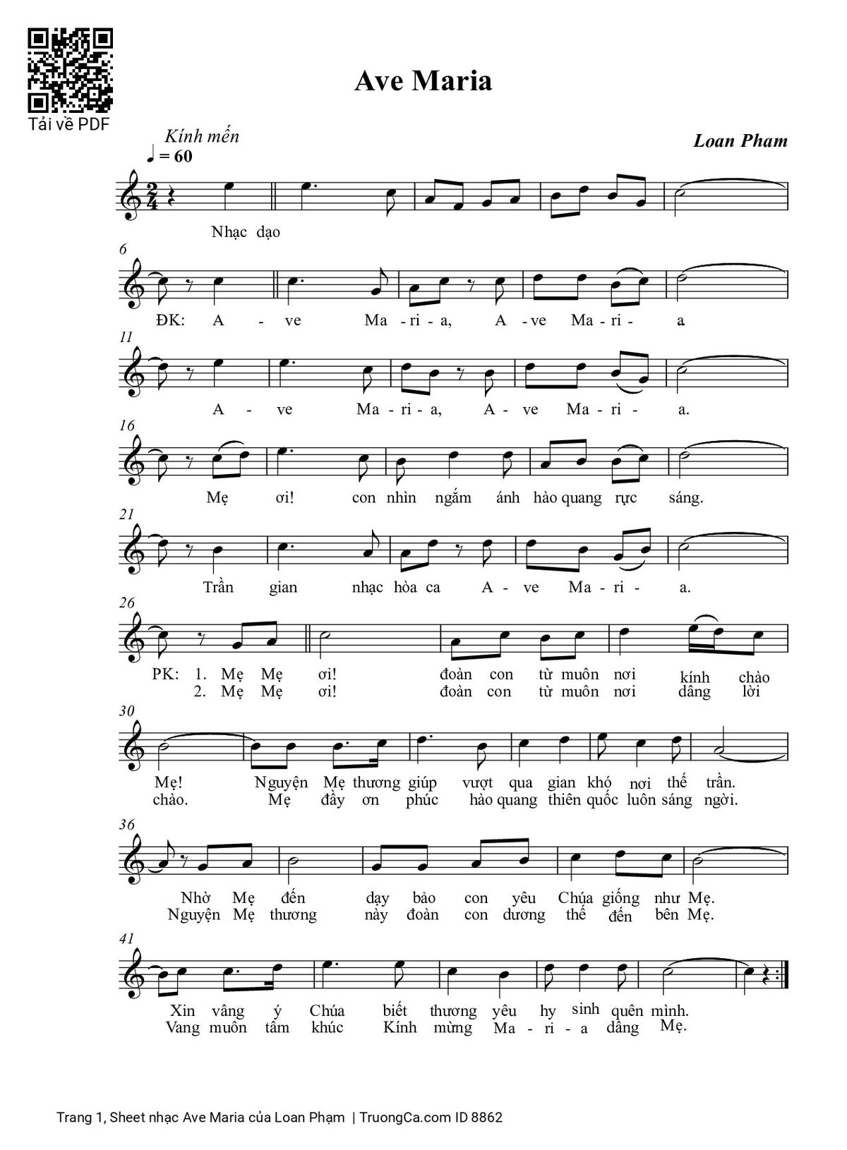 2/ Mẹ Mẹ ơi! đoàn con từ muôn nơi dâng lời chào. Mẹ đầy ơn phúc hào quang thiên quốc luôn sáng ngời. Nguyện Mẹ thương này đoàn con dương thế đến bên Mẹ. Vang muôn tâm khúc Kính mừng Ma-ri-a dâng Mẹ.