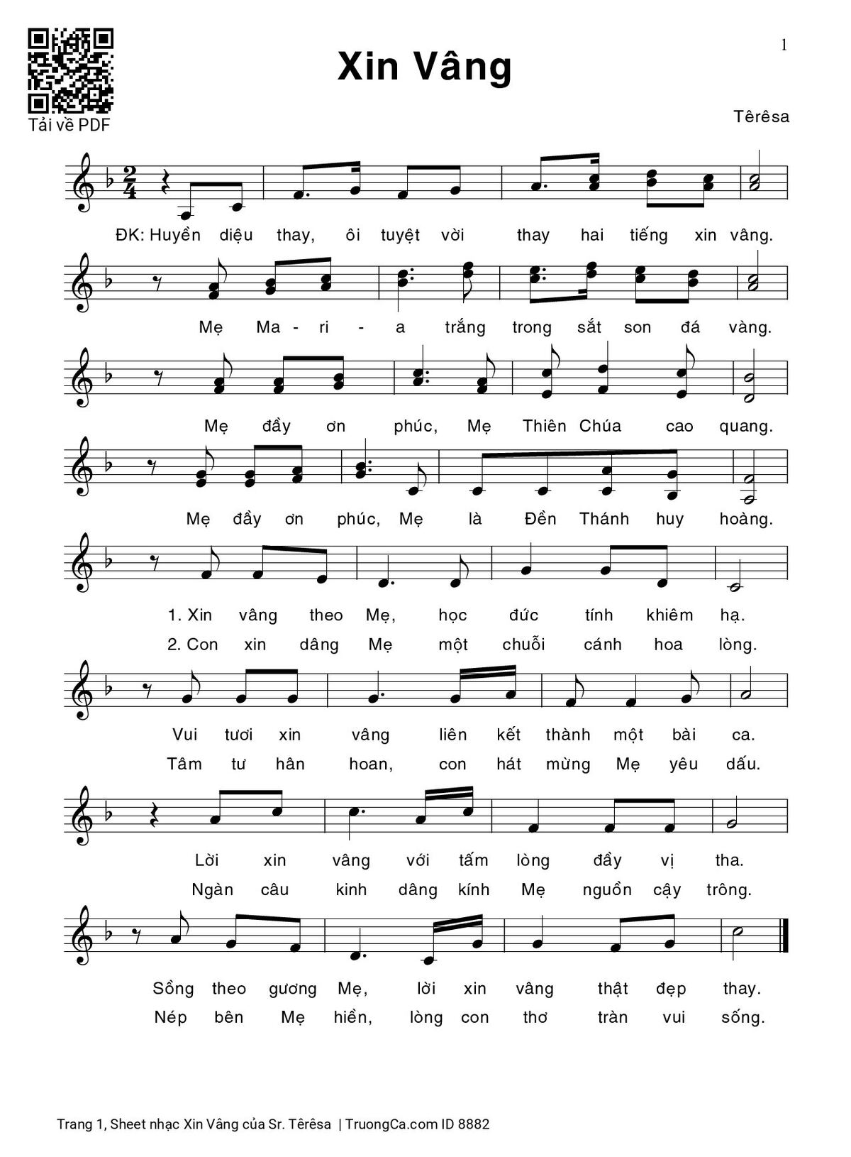 Điệp khúc. Huyền diệu thay, ôi tuyệt vời thay hai tiếng xin vâng. Mẹ Ma-ri-a trắng trong sắt son đá vàng. Mẹ đầy ân phúc, Mẹ Thiên Chúa cao quang. Mẹ đầy ân phúc, Mẹ là Đền Thánh huy hoàng.