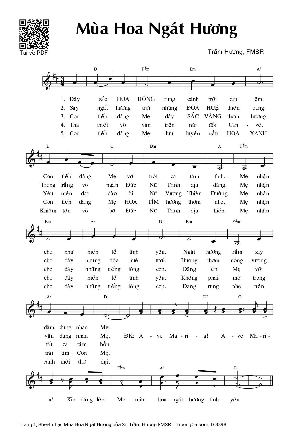 Điệp khúc: Ave Maria, Ave Maria xin dâng lên Mẹ mùa hoa ngát hương tình yêu.