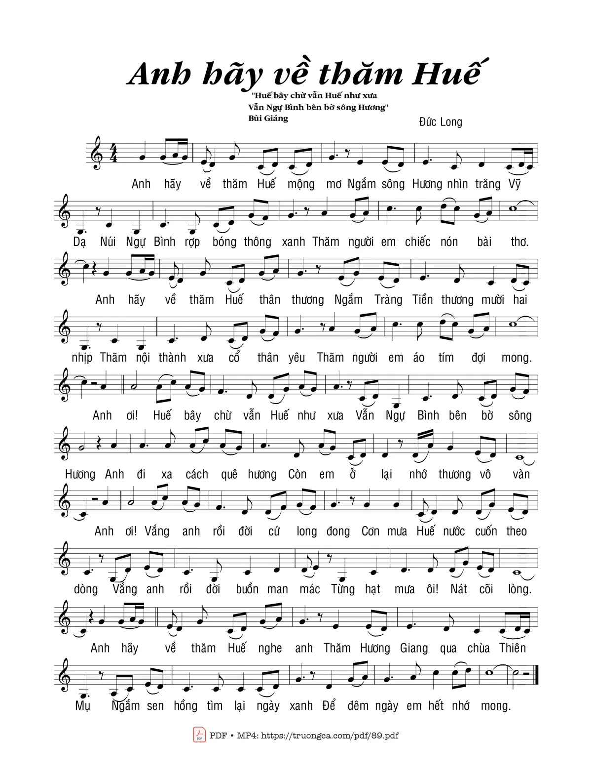 Đức Long Anh hãy về thăm Huế mộng mơ Ngắm sông Hương nhìn trăng Vỹ Dạ [PDF] [Sheet] [Lời H.A] [Mp4/Midi]