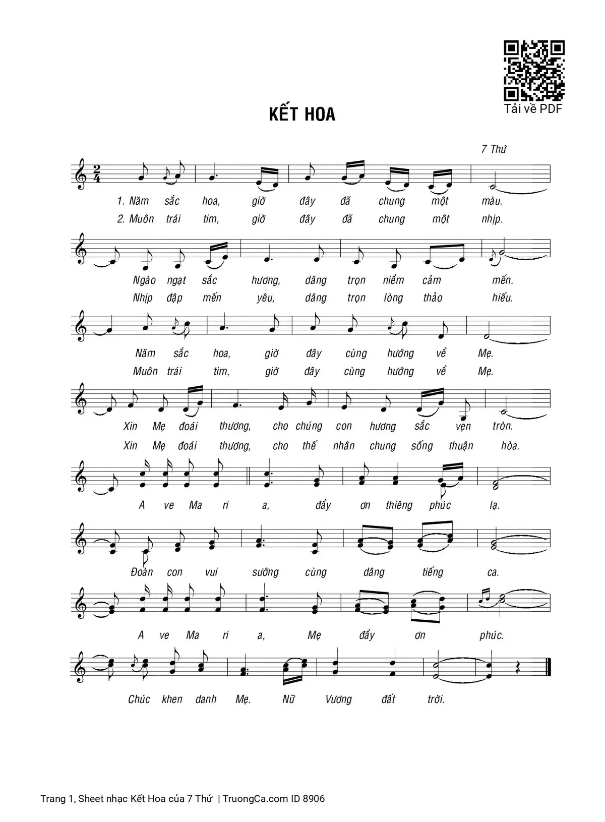 Điệp khúc. A-ve Ma-ri-a, đầy ơn thiêng phúc lạ. Đoàn con vui sướng cùng dâng tiếng ca. A-ve Ma-ri-a, Mẹ đầy ơn phúc. Chúc khen danh Mẹ, Nữ Vương đất trời.