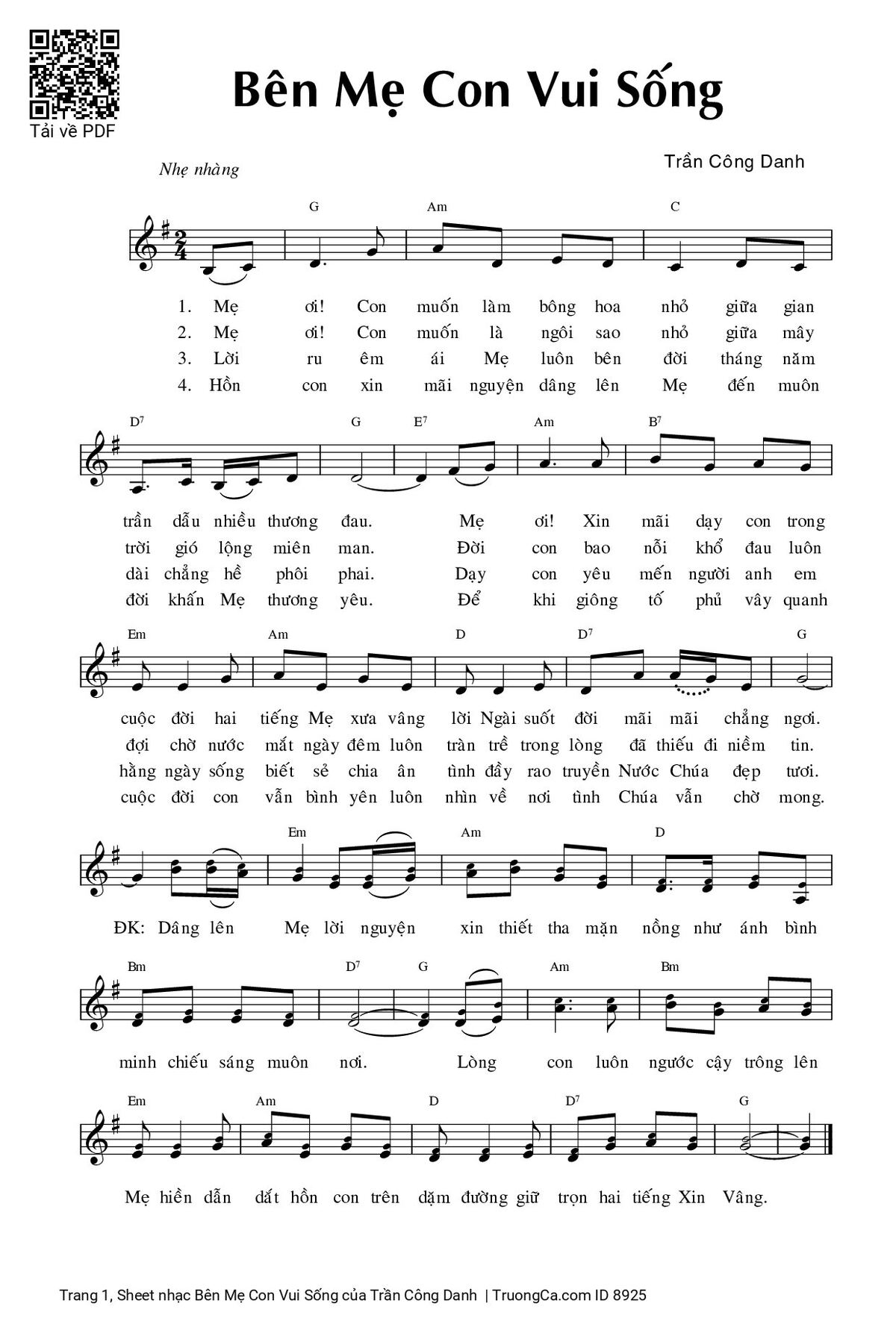 3. Lời ru êm ái mẹ luôn bên đời tháng năm dài chẳng hề phôi phai. Dạy con yêu mến người anh em hằng ngày sống biết sẻ chia ân tình đầy rao truyền nước Chúa đẹp tươi.