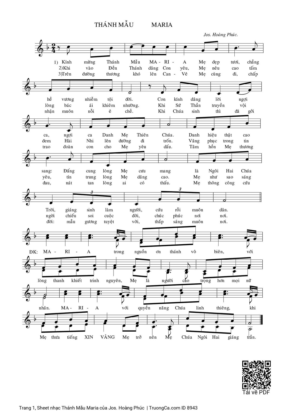 Điệp khúc. Maria trong nguồn ơn thánh vô biên, với lòng thanh khiết trinh nguyên, Mẹ là người cao trọng hơn mọi nữ nhân. Maria với quyền năng Chúa linh thiêng, khi Mẹ thưa tiếng Xin Vâng, Mẹ trở nên Mẹ Chúa Ngôi Hai giáng trần.