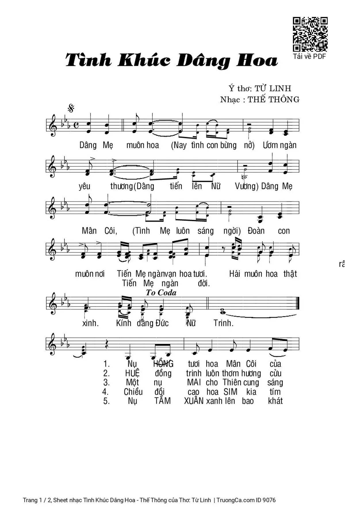 Điệp khúc. Dâng Mẹ muôn hoa Ươm ngàn yêu thương Dâng Mẹ Mân Côi Đoàn con muôn nơi. Tiến Mẹ ngàn vạn hoa tươi. Hái muôn hoa thật xinh. Kính dâng Đức Nữ Trinh.