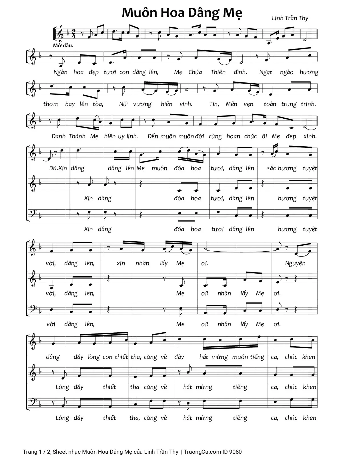 Điệp khúc. Xin dâng, dâng lên Mẹ muôn đóa hoa tươi, dâng lên sắc hương tuyệt vời, dâng lên, xin nhận lấy Mẹ ơi. Nguyện dâng đây lòng con thiết tha, cùng về đây hát mừng muôn tiếng ca, chúc khen Mẹ tràn phúc ân chan hòa, Mẹ dấu yêu đẹp hơn ngàn bông hoa.
