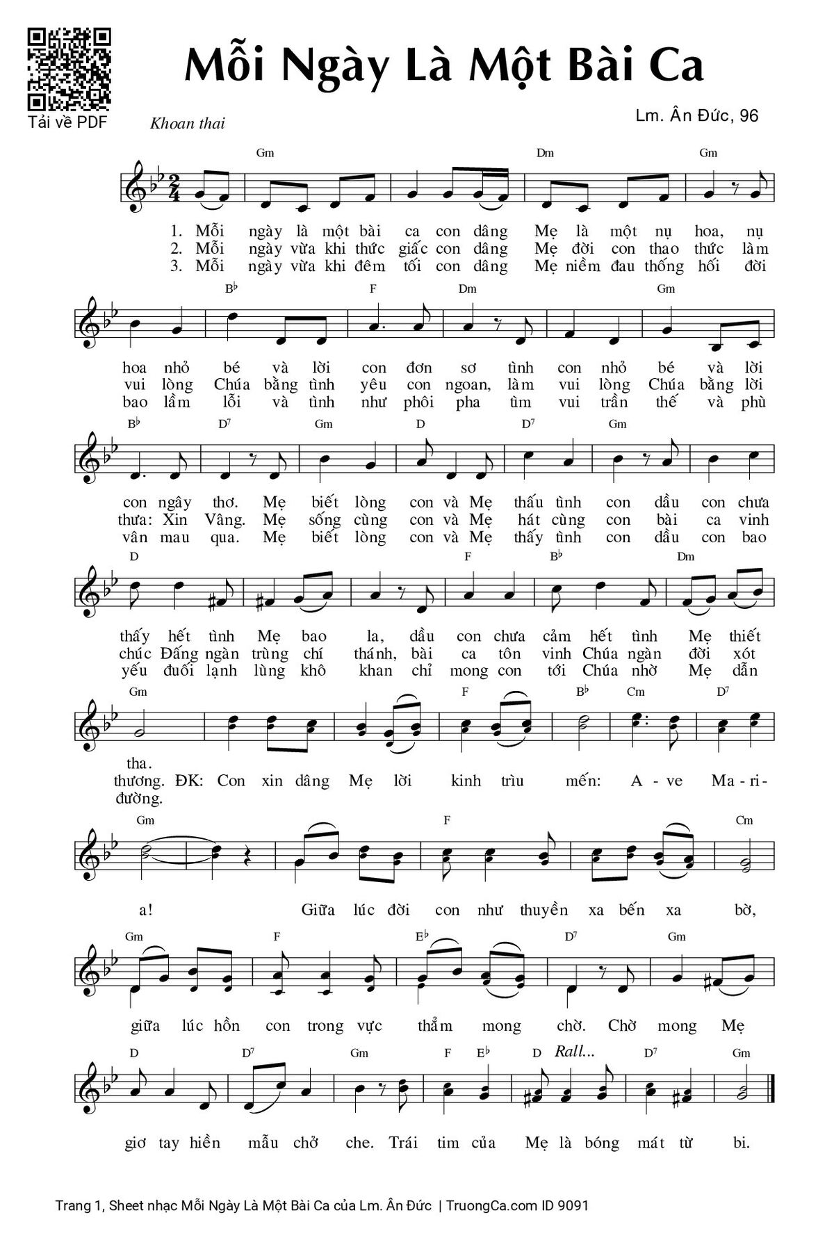 2. Mỗi ngày vừa khi thức giấc con dâng Mẹ đời con thao thức làm vui lòng Chúa bằng tình yêu con ngoan, làm vui lòng Chúa bằng lời thưa: Xin vâng. Mẹ sống cùng con và Mẹ hát cùng con bài ca vinh chúc Đấng ngàn trùng chí thánh, bài ca tôn vinh Chúa ngàn đời xót thương.