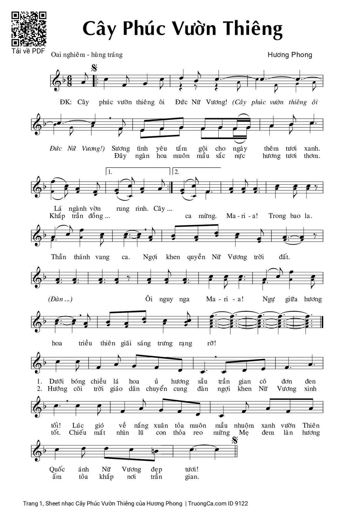 Điệp khúc. Cây phúc vườn thiêng ôi Đức Nữ Vương . Sương tình yêu tắm gội cho ngày thêm tươi xanh. Lá ngành vờn rung rinh. Cây phúc vườn thiêng ôi Đức Nữ Vương . Đây ngàn hoa muôn màu sắc rực hương tươi thơm. Khắp trần đồng ca mừng. Maria, trong bao la, thần thánh vang ca. Ngợi khen quyền Nữ Vương trời đất. Ôi nguy nga Maria ngự giữa hương hoa triều thiên giãi sáng trưng rạng rỡ.