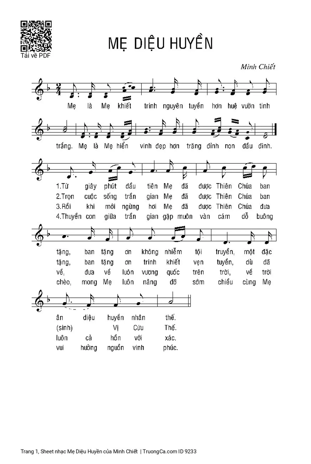 Điệp khúc: Mẹ là Mẹ khiết trinh nguyên tuyền hơn huệ vườn tinh trắng. Mẹ là Mẹ hiển vinh đẹp hơn trăng đỉnh non đầu đình.