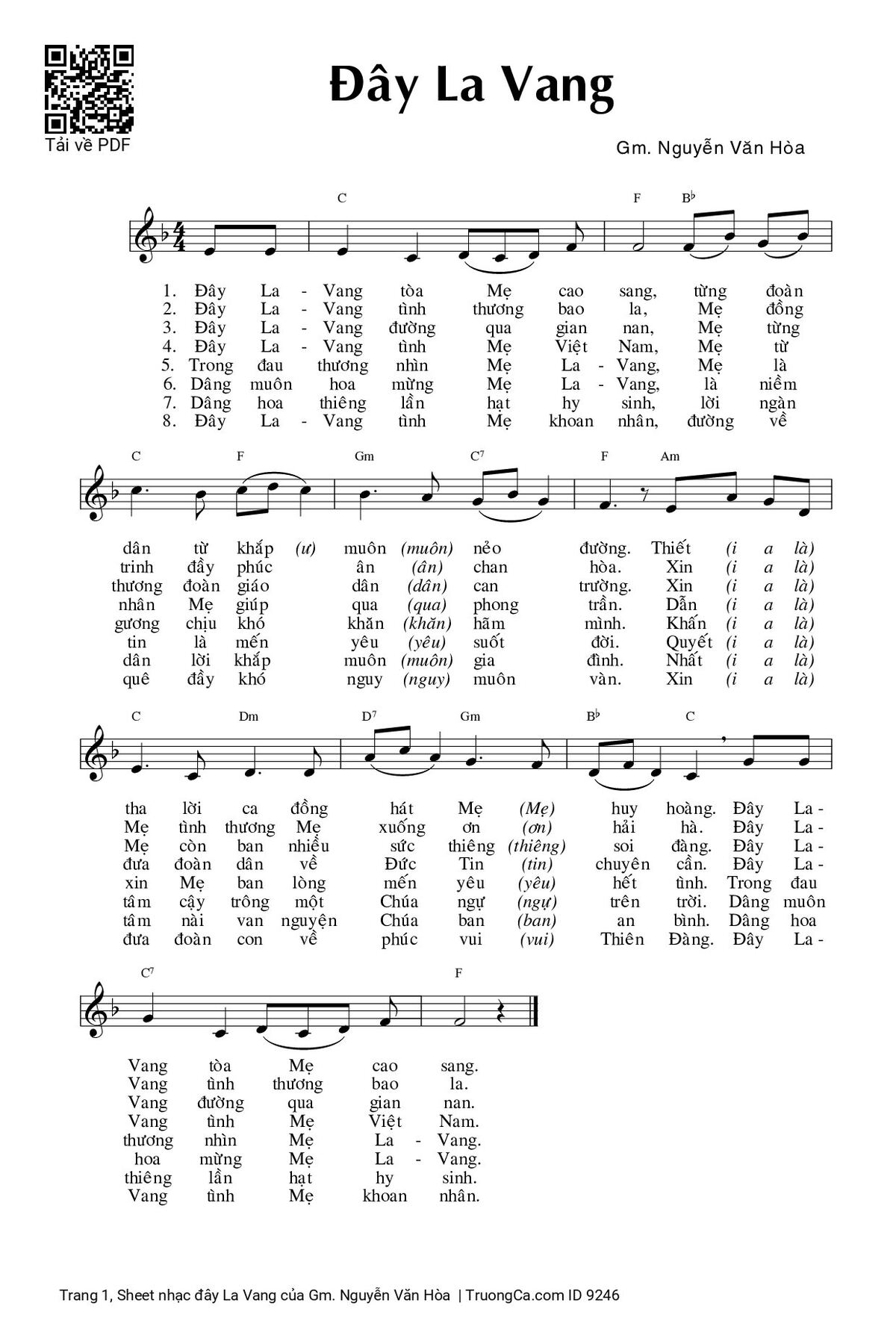 3. Đây La - Vang đường qua gian nan, Mẹ từng thương đoàn giáo dân (dân) can trường. Xin (i a là) Mẹ còn ban nhiều sức thiêng (thiêng) soi đàng. Đây La - Vang đường qua gian nan.