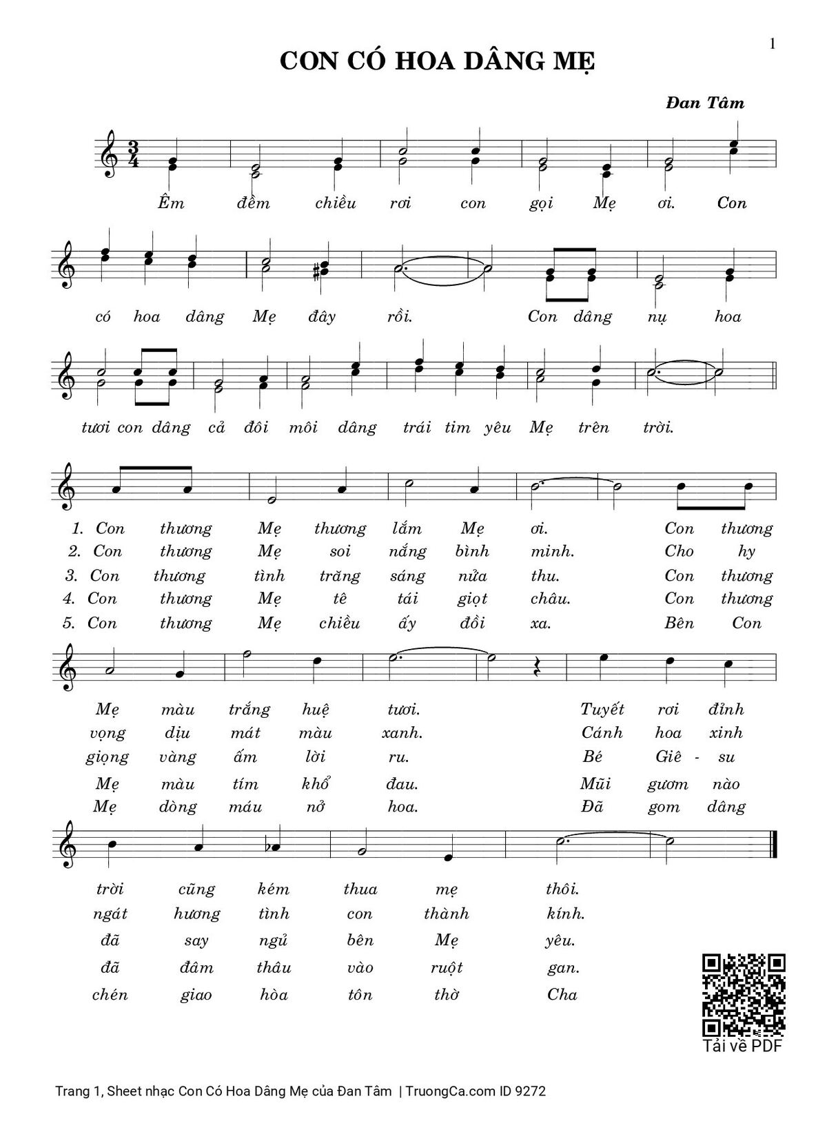 1. Con thương Mẹ thương lắm Mẹ ơi. Con thương Mẹ màu trắng huệ tươi. Tuyết rơi đỉnh trời cũng kém thua Mẹ thôi.