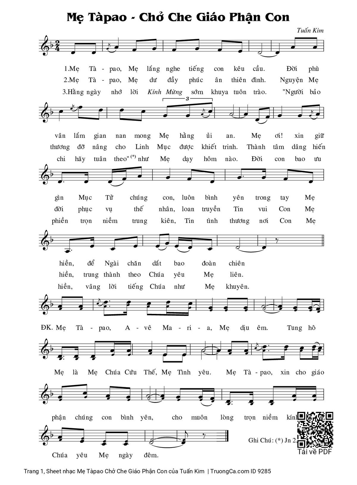 Điệp khúc. Mẹ Tà - pao, A - vê Ma - ri - a, Mẹ dịu êm. Tung hô Mẹ là Mẹ Chúa Cứu Thế, Mẹ Tình yêu. Mẹ Tà - pao, xin cho giáo phận chúng con bình yên, cho muôn lòng trọn niềm kính Mến Chúa yêu Mẹ ngày đêm.
