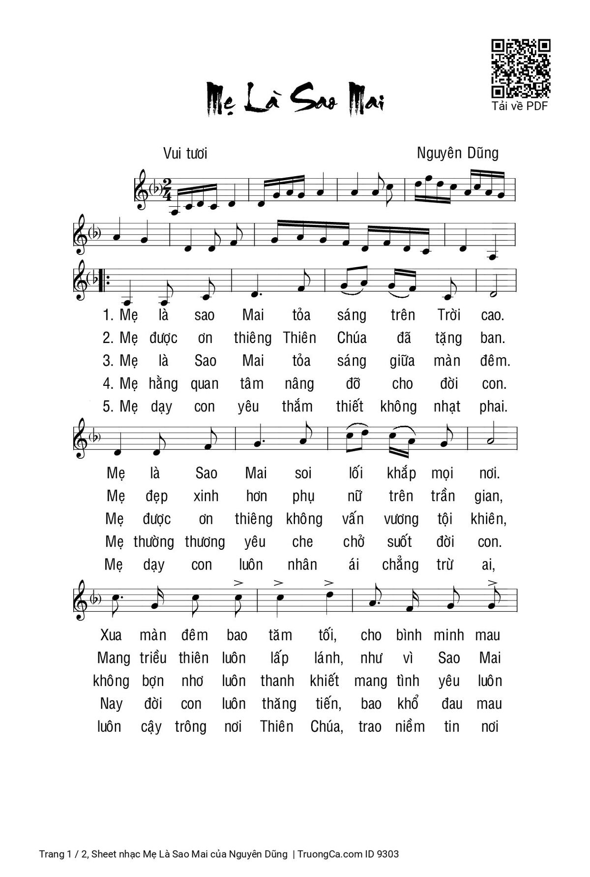 1. Mẹ là sao Mai tỏa sáng trên Trời cao. Mẹ là Sao Mai soi lối khắp mọi nơi. Xua màn đêm bao tăm tối, cho bình minh mau vươn tới, đưa con vào ngày mới thật đẹp tươi.