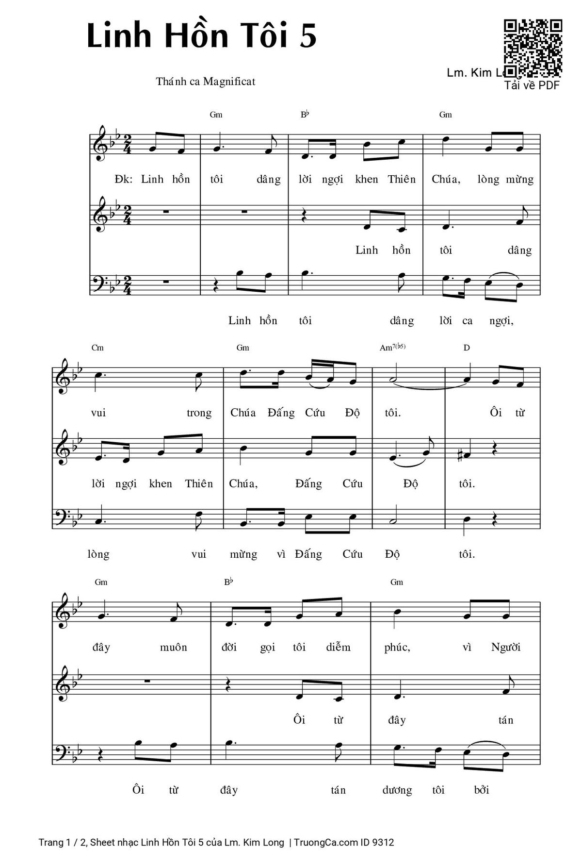 Điệp khúc. Linh hồn tôi dâng lời ngợi khen Thiên Chúa, lòng mừng vui trong Chúa, Đấng Cứu Độ tôi. Ôi từ đây muôn đời gọi tôi diễm phúc, vì Người thương trông đến phận tôi tá này.