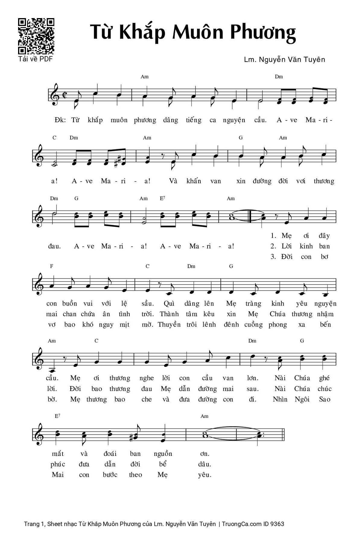 Điệp khúc. Từ khắp muôn phương dâng tiếng ca nguyện cầu. A - ve Ma - ri - a! A - ve Ma - ri - a! Và khấn van xin đường đời vơi thương đau. A - ve Ma - ri - a! A - ve Ma - ri - a!