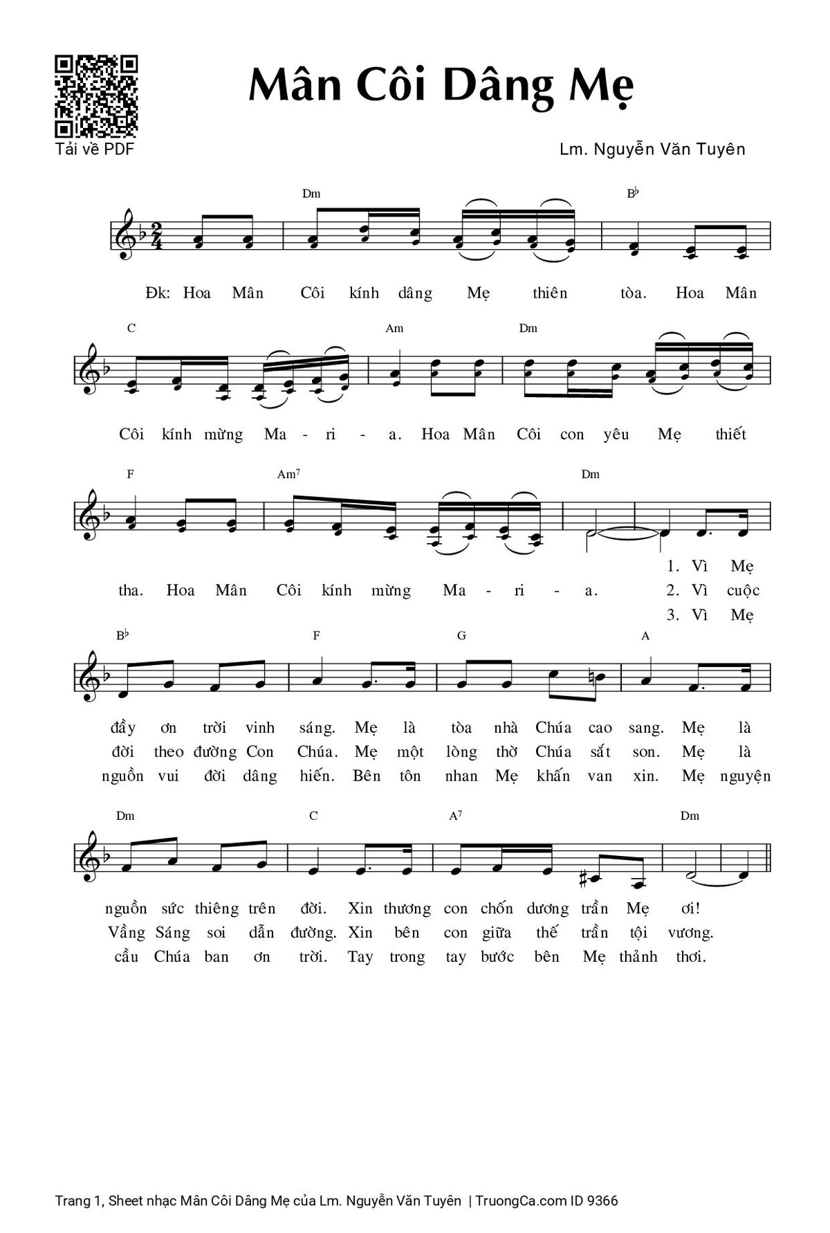 Điệp khúc. Hoa Mân Côi kính dâng Mẹ thiên tòa. Hoa Mân Côi kính mừng Ma - ri - a. Hoa Mân Côi con yêu Mẹ thiết tha. Hoa Mân Côi kính mừng Ma - ri - a.