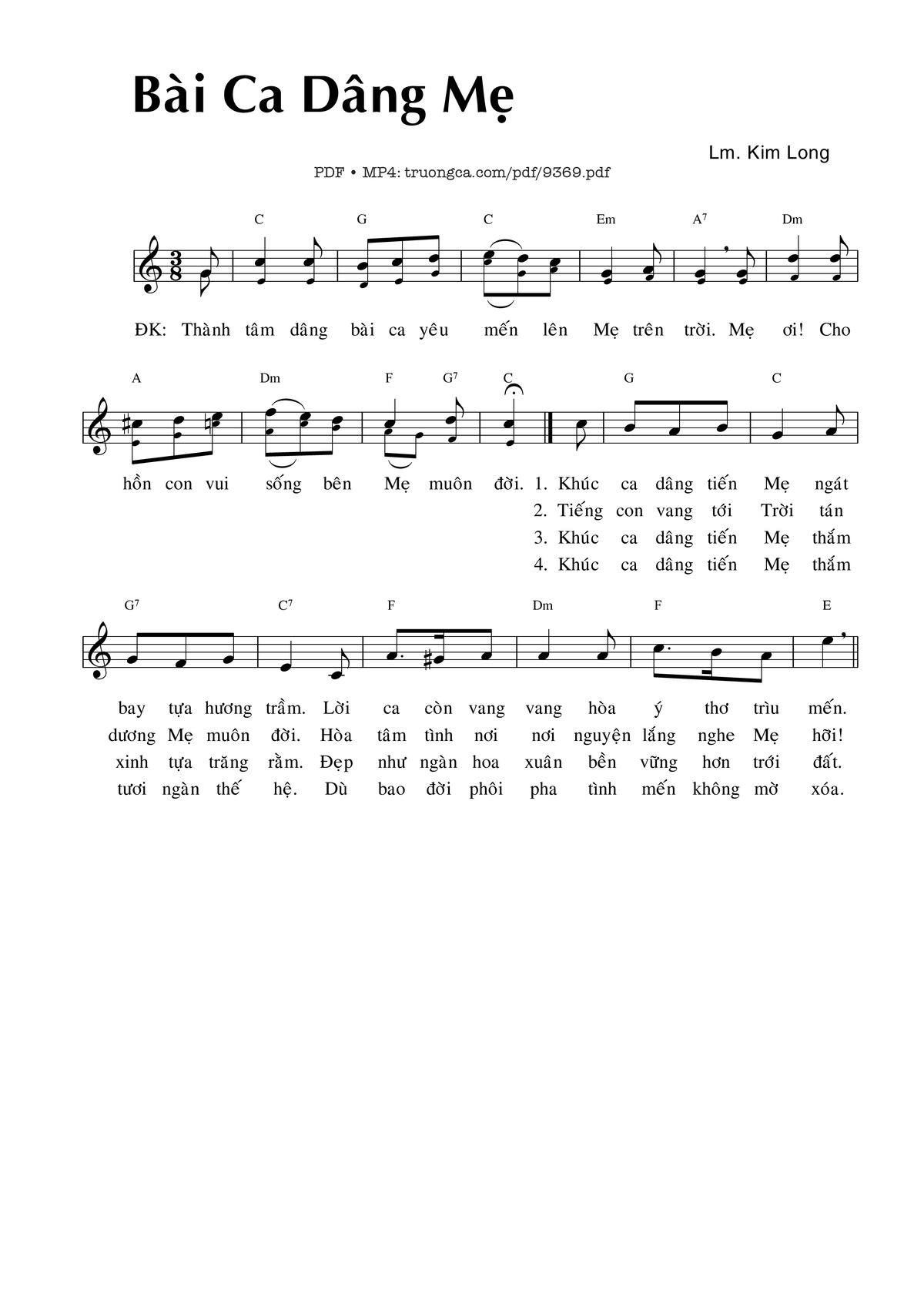 Lm. Kim Long BÀI CA DÂNG MẸ Lm Kim Long ÐK Thành tâm dâng bài ca yêu mến lên Mẹ trên trời [PDF] [Sheet] [Lời H.A] [Mp4/Midi]