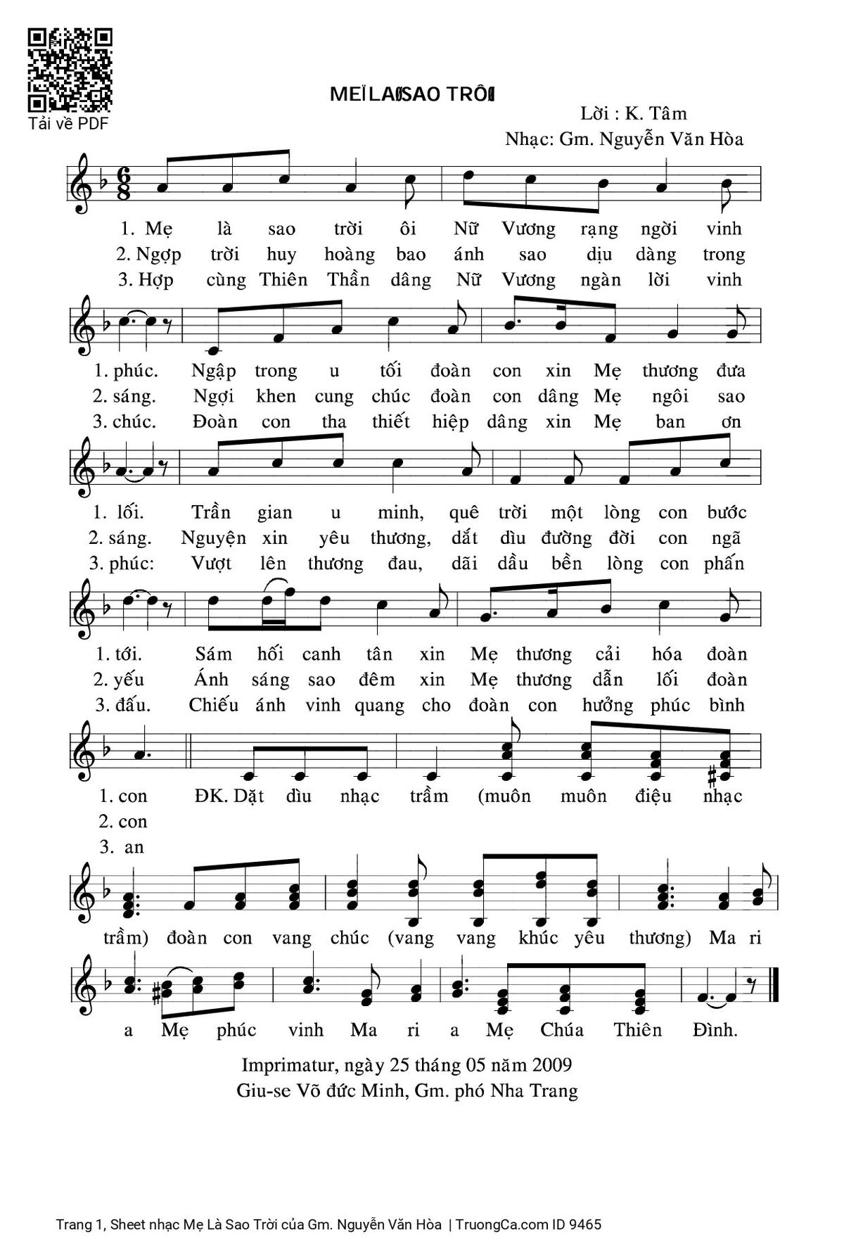 1. Mẹ là sao trời ôi Nữ Vương rạng ngời vinh phúc. Ngập trong u tối đoàn con xin Mẹ thương đưa lối. Trần gian u minh, quê trời một lòng con bước tới. Sám hối canh tân xin Mẹ thương cải hóa đoàn con.