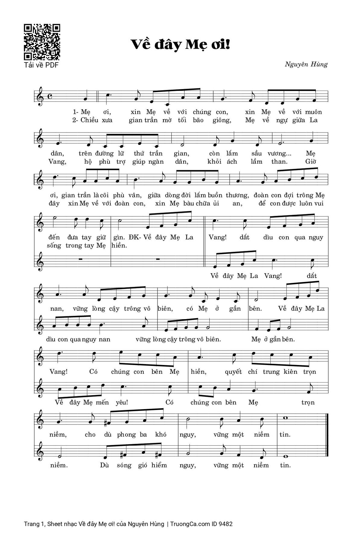 Điệp khúc. Về đây Mẹ La Vang! dắt dìu con qua nguy nan, vững lòng cậy trông vô biên, có Mẹ ở gần bên. Về đây Mẹ La Vang! Có chúng con bên Mẹ hiền, quyết chí trung kiên trọn niềm, cho dù phong ba khó nguy, vững một niềm tin.