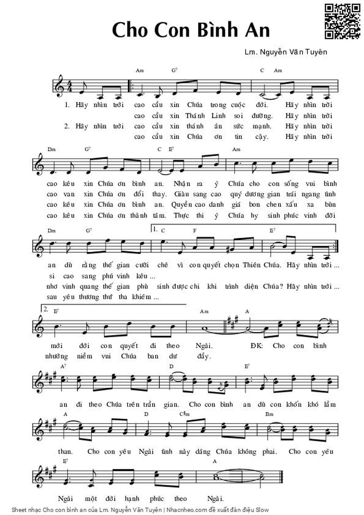 Chọn nút dấu + để tăng tông lên nửa cung, nút dấu - để giảm tông xuống nửa cung. Rê chuột vào hợp âm để xem các thế bấm hợp âm của bài hát Cho con bình an.