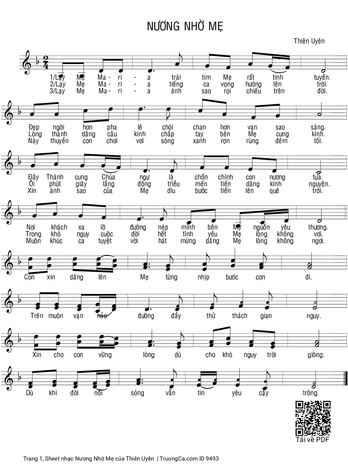 Điệp khúc. Con xin dâng lên Mẹ từng nhịp bước con đi. Trên muôn vạn nẻo đường đầy thử thách gian nguy. Xin cho con vững lòng thành tâm mến yêu cậy trông. Dù khi đời nổi sóng và những lúc trời giông.