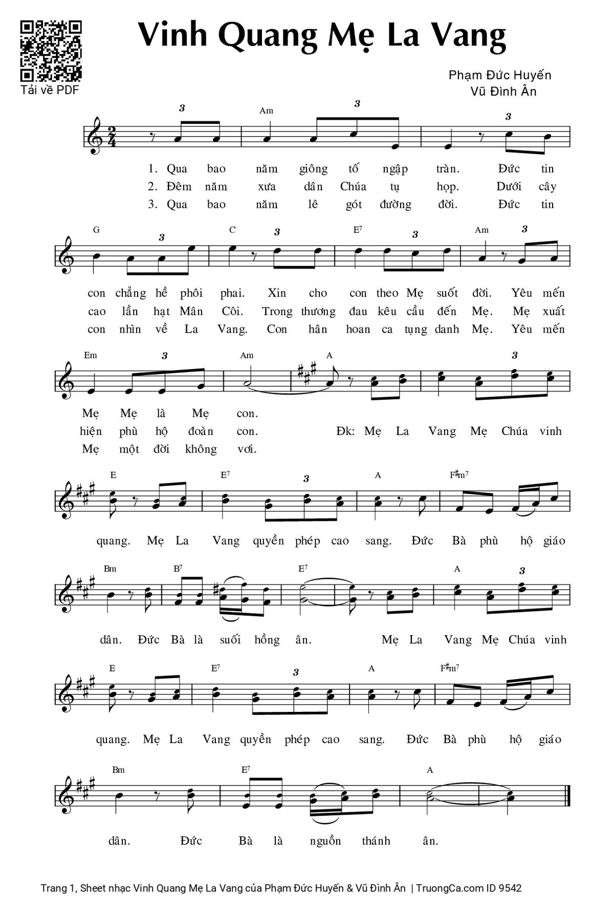 Điệp khúc. Mẹ La Vang Mẹ Chúa vinh quang. Mẹ La Vang quyền phép cao sang. Đức Bà phù hộ giáo dân. Đức Bà là suối hồng ân. Mẹ La Vang Mẹ Chúa vinh quang. Mẹ La Vang quyền phép cao sang. Đức Bà phù hộ giáo dân. Đức Bà là nguồn thánh ân.