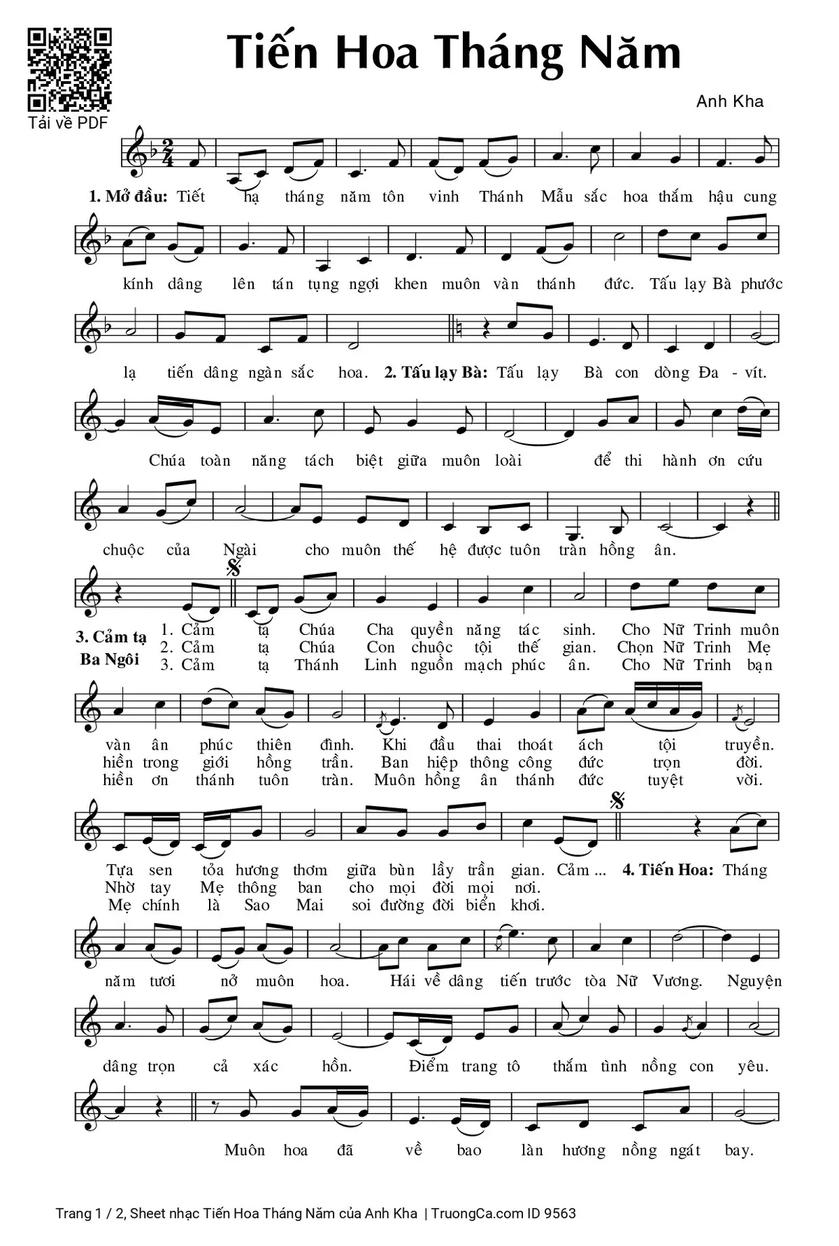 4. Tiến Hoa: Tháng năm tươi nở muôn hoa. Hái về dâng tiến trước tòa Nữ Vương. Nguyện dâng trọn cả xác hồn. Điểm trang tô thắm tình nồng con yêu. Muôn hoa đã về bao làn hương nồng ngát bay.