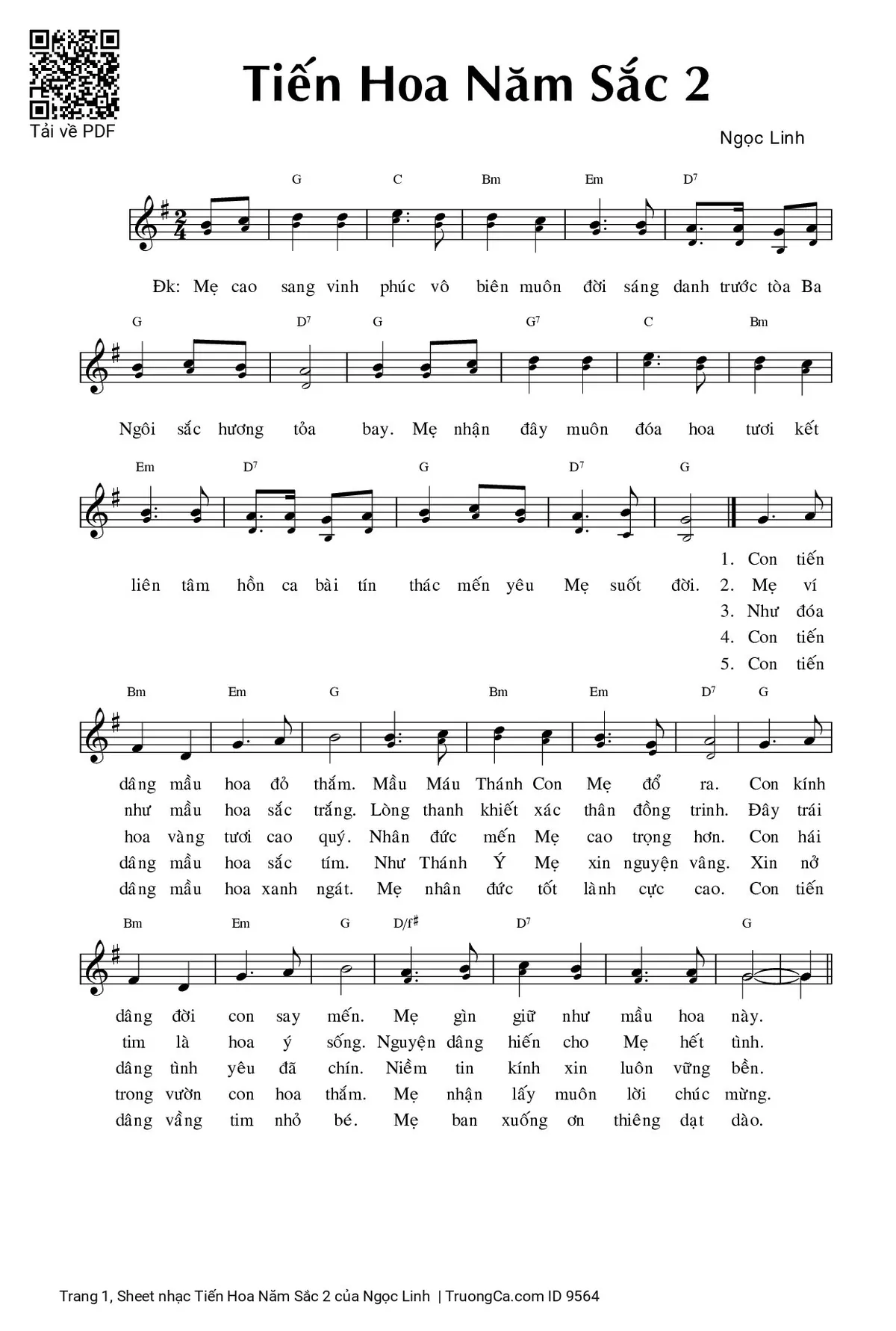 5. Con tiến dâng mầu hoa xanh ngát. Mẹ nhân đức tốt lành cực cao. Con tiến dâng vầng tim nhỏ bé. Mẹ ban xuống ơn thiêng dạt dào.