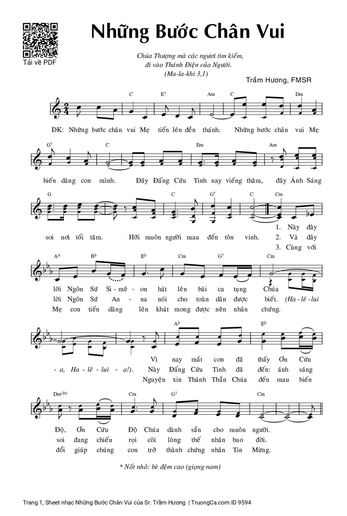 Điệp khúc. Những bước chân vui Mẹ tiến lên đền thánh. Những bước chân vui Mẹ hiến dâng con mình. Đây Đấng Cứu Tinh nay viếng thăm, đây Ánh Sáng soi nơi tối tăm. Hỡi muôn người mau đến tôn vinh.