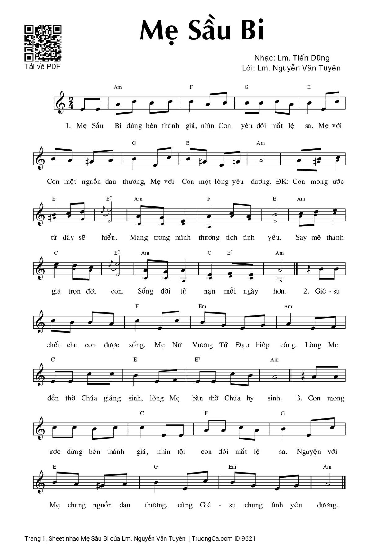 1. Mẹ Sầu Bi đứng bên thánh giá, nhìn Con yêu đôi mắt lệ sa. Mẹ với Con một nguồn đau thương, Mẹ với Con một lòng yêu đương.