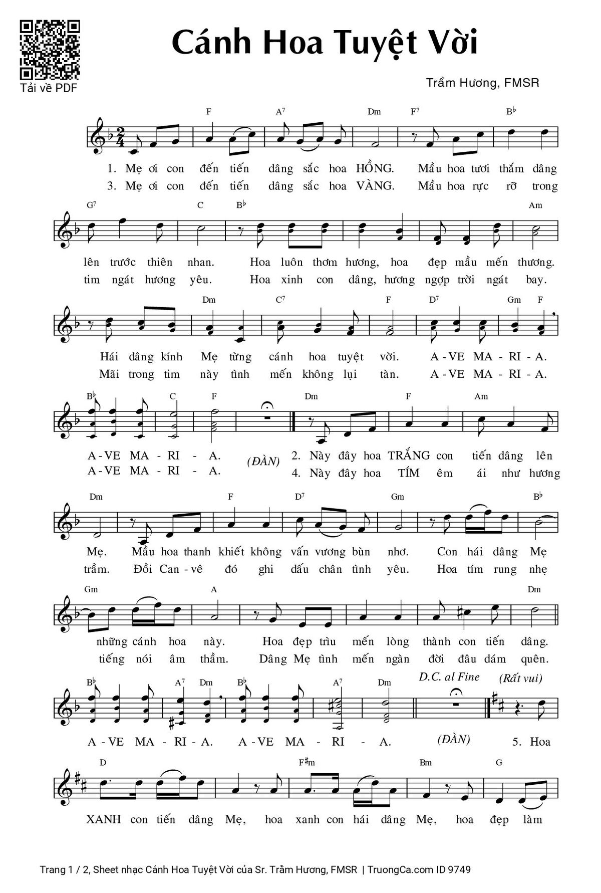 2. Này đây hoa TRẮNG con tiến dâng lên Mẹ. Mầu hoa thanh khiết không vấn vương bùn nhơ. Con hái dâng Mẹ những cánh hoa này. Hoa đẹp trìu mến lòng thành con tiến dâng. A - VE MA - RI - A. A - VE MA - RI - A.