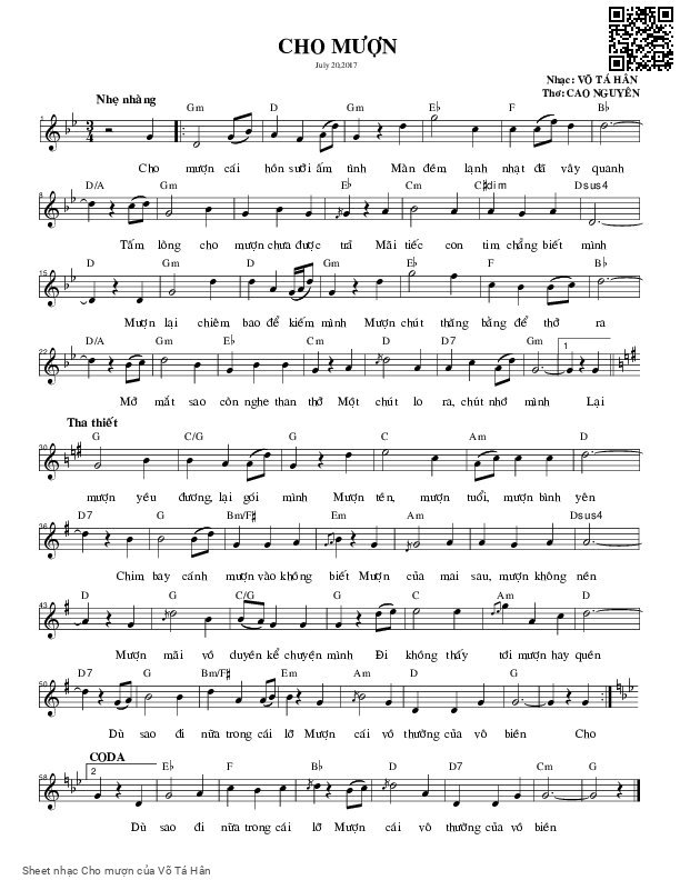 Chọn nút dấu + để tăng tông lên nửa cung, nút dấu - để giảm tông xuống nửa cung. Rê chuột vào hợp âm để xem các thế bấm hợp âm của bài hát Cho mượn.
