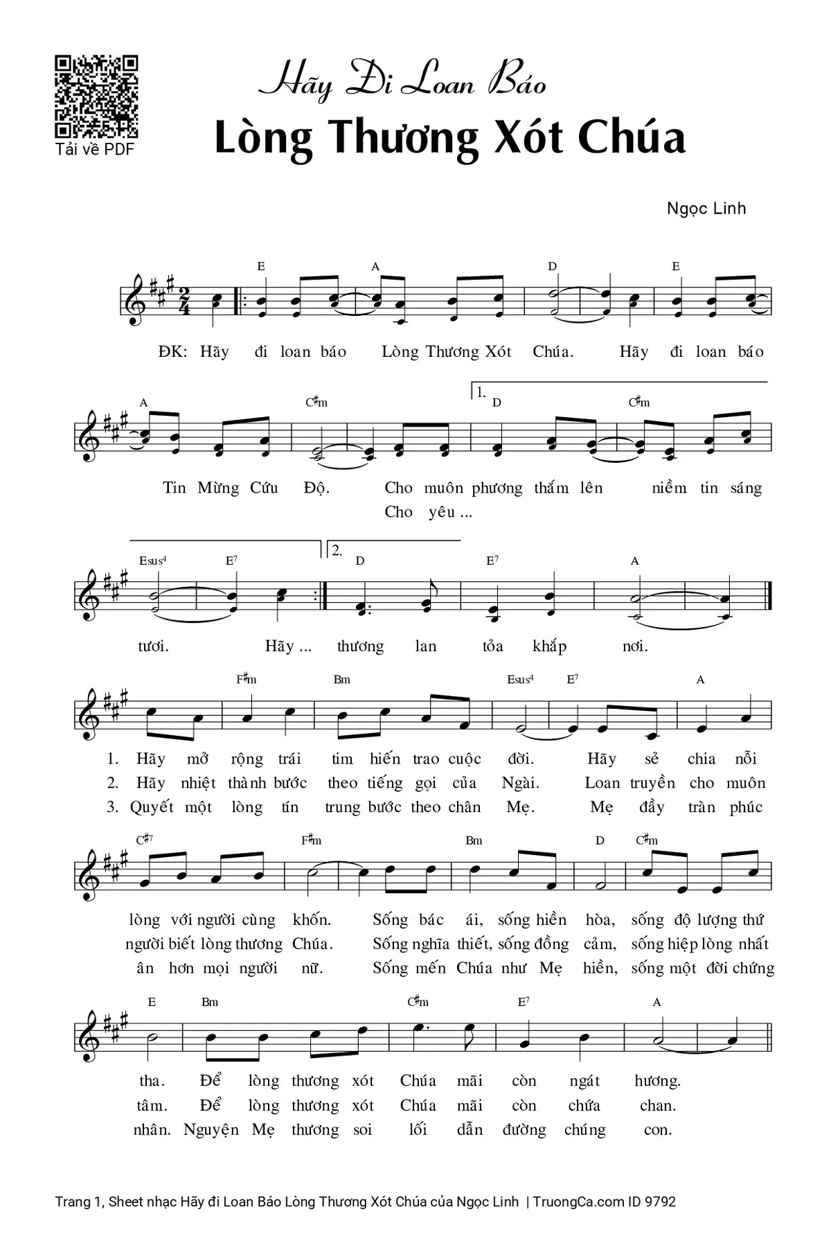 Điệp khúc. Hãy đi loan báo lòng thương xót Chúa. Hãy đi loan báo Tin Mừng cứu độ. Cho muôn phương thắm lên niềm tin sáng tươi. Hãy đi loan báo lòng thương xót Chúa. Hãy đi loan báo Tin Mừng cứu độ. Cho yêu thương lan toả khắp nơi.
