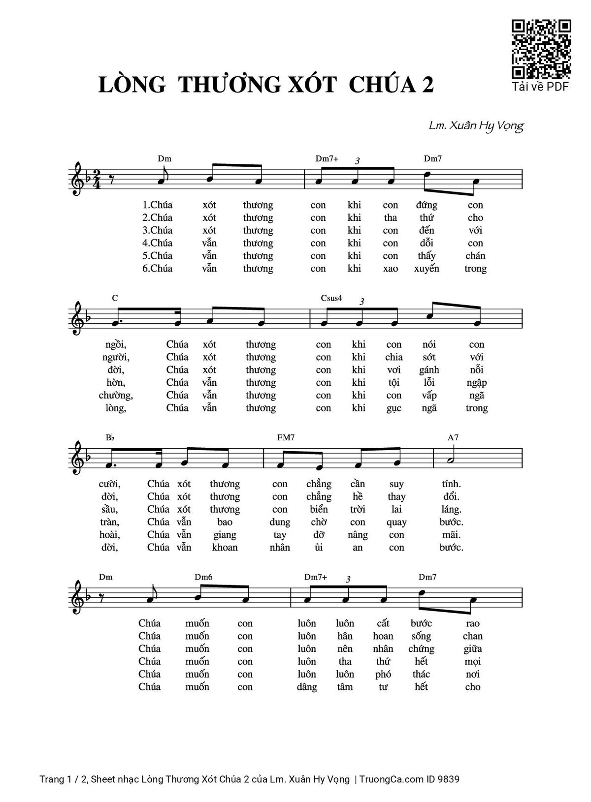 Câu đầu: LÒNG THƯƠNG XÓT CHÚA Tác giả Lm Xuân Hy Vọng