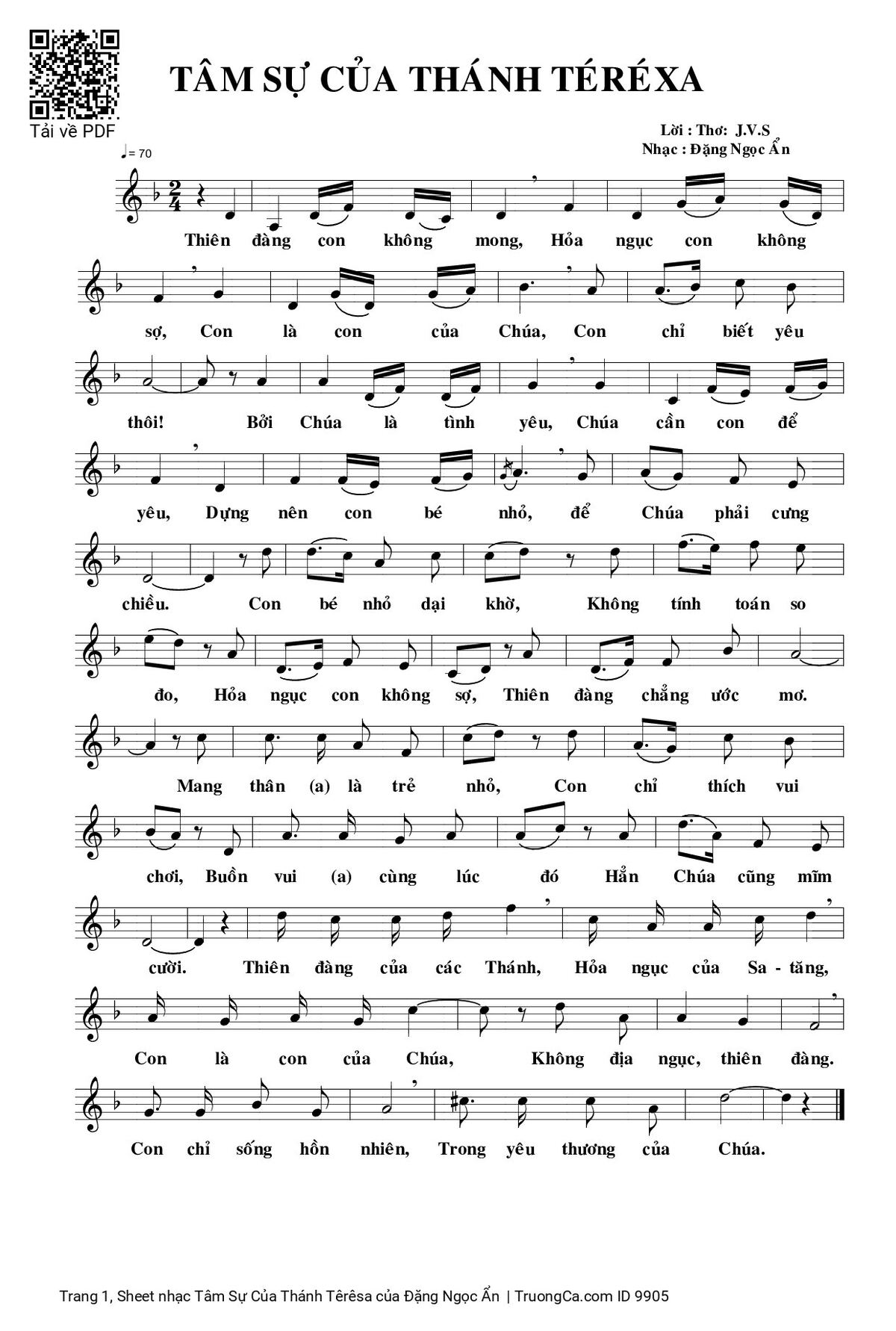Con bé nhỏ dại khờ, không tính toán so đo, hỏa ngục con không sợ, thiên đàng chẳng ước mơ. Mang thân (a) là trẻ nhỏ, con chỉ thích vui chơi, buồn vui (a) cũng lúc đó, hẳn Chúa cũng mỉm cười.