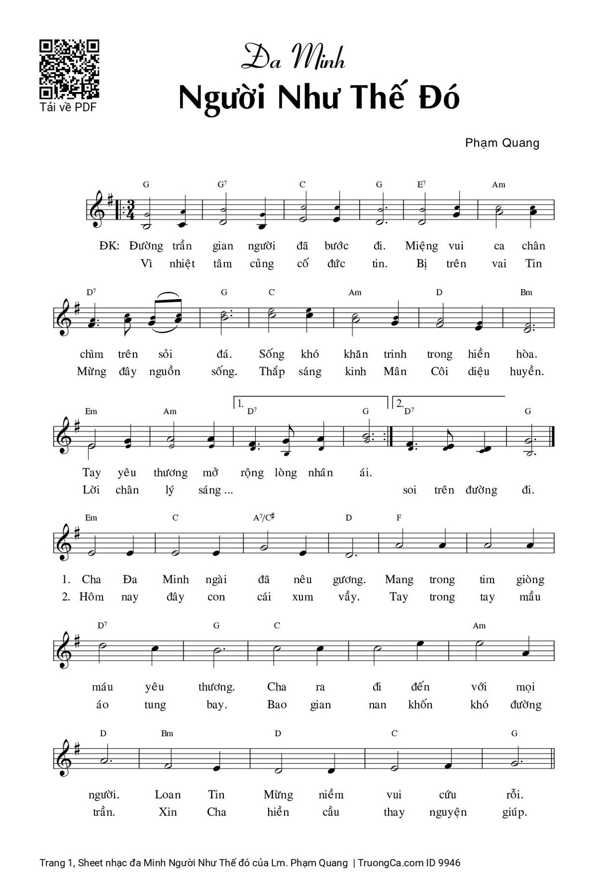 Điệp khúc. Đường trần gian người đã bước đi miệng vui ca chân chìm trên sỏi đá. Sống khó khăn trinh trong hiền hòa. Tay yêu thương mở rộng lòng nhân ái. Vì nhiệt tâm củng cố đức tin. Bị trên vai Tin Mừng đây nguồn sống. Thắp sáng kinh Mân Côi diệu huyền. Lời chân lý sáng soi trên đường đi.
