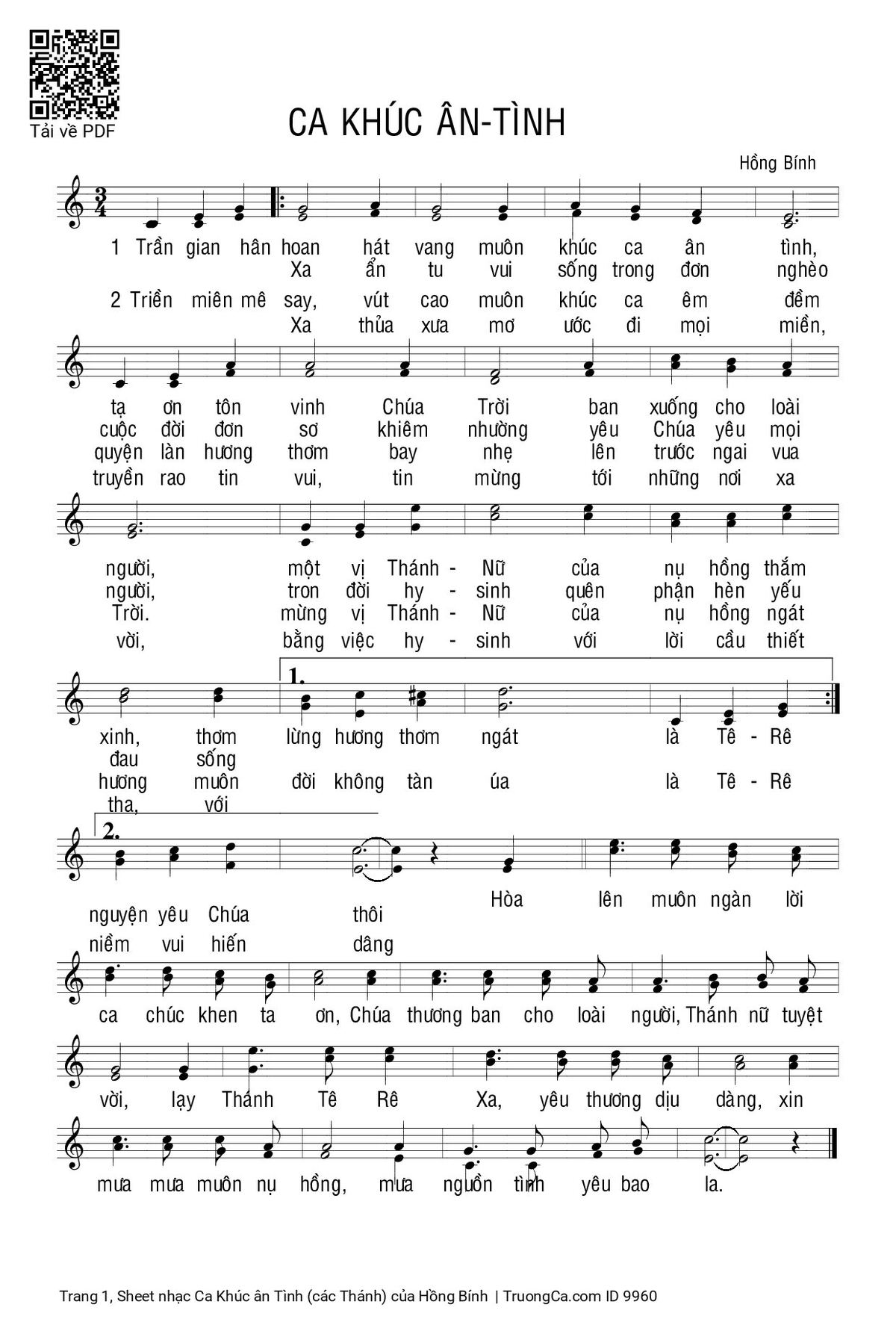 Trần gian hôm nay hát vang muôn khúc ca ân tình, tạ ơn tôn vinh Chúa Trời, ban xuống cho loài người một vị Thánh Nữ của nụ hồng thắm xinh, thơm lừng hương thơm ngát. Là Tê-rê-xa ẩn tu vui sống trong đơn nghèo, cuộc đời đơn sơ khiêm nhường, yêu Chúa yêu mọi người, trọn đời hy sinh quên phận hèn yếu đau, sống nguyện yêu Chúa thôi.