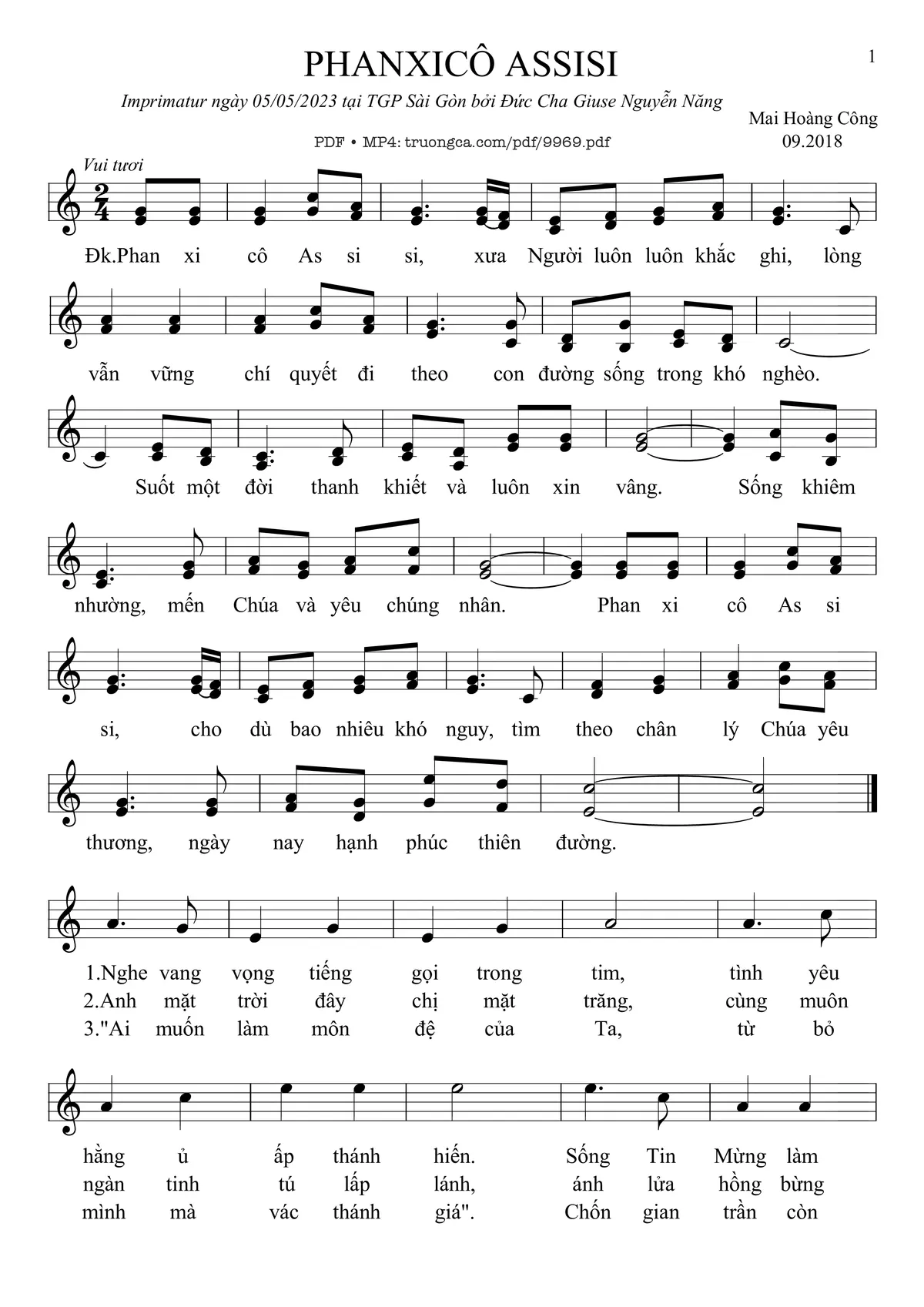 Điệp khúc. Phanxicô Assisi, xưa Người luôn luôn khắc ghi, lòng vẫn vững chí quyết đi theo, con đường sống trong khó nghèo. Suốt một đời thanh khiết và luôn xin vâng, sống khiêm nhường mến Chúa và yêu chúng nhân. Phanxicô Assisi, cho dù bao nhiêu khó nguy, tìm theo chân lý Chúa yêu thương, ngày nay hạnh phúc thiên đường.