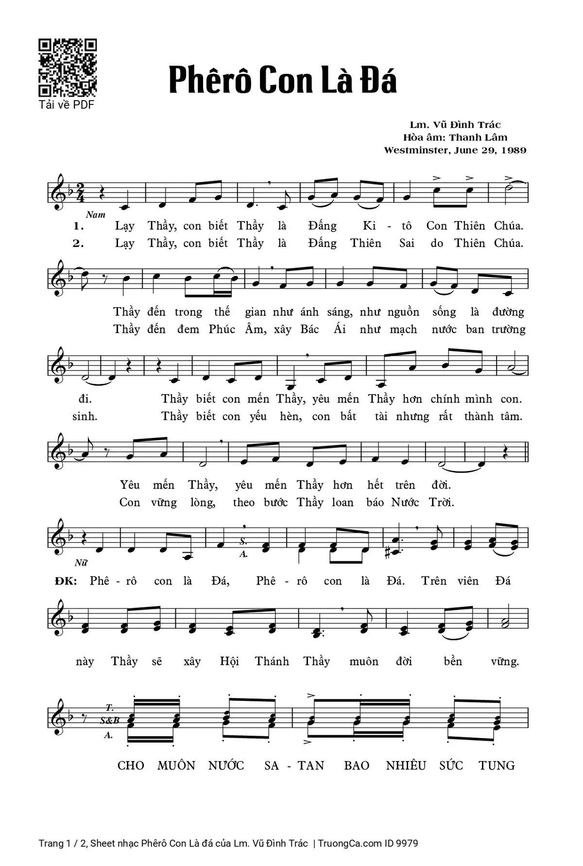 Điệp khúc: Phê-rô con là Đá, Phê-rô con là Đá. Trên viên Đá này Thầy sẽ xây Hội Thánh Thầy muôn đời bền vững. Cho muôn nước Sa-tan bao nhiêu sức tung hoành, bao nhiêu sức vẫy vùng nhưng vẫn không hại được con. Thầy trao cho con chìa khóa Nước Trời. Con cầm buộc ai, giải thoát ai thì trên trời cũng cầm buộc và giải thoát theo ý con.