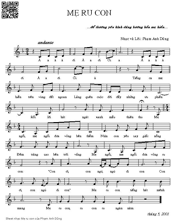 Phần nghe hát Mẹ ru con (Phạm Anh Dũng) được nhúng từ Youtube, Musescore hoặc link ngoài và chịu sự kiểm soát bản quyền của bên thứ ba đó, vì vậy có thể bị xóa hoặc chèn quảng cáo bất kỳ lúc nào. Nếu bạn không nghe - xem được ca sĩ hát tức là đã bị Youtube hoặc Musescore kiểm soát.