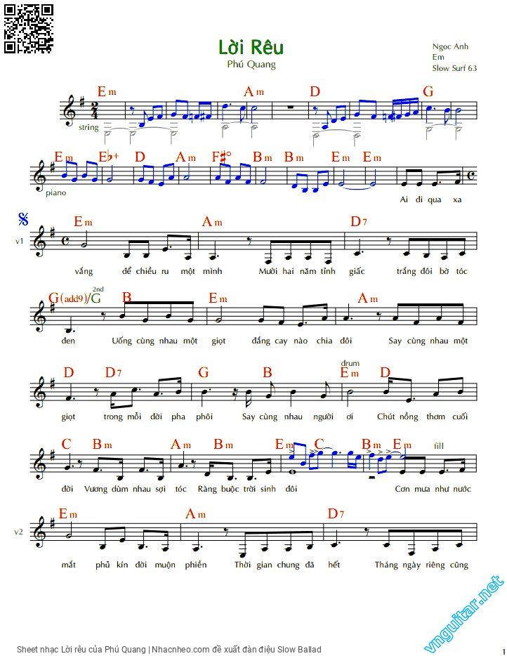 Chọn nút dấu + để tăng tông lên nửa cung, nút dấu - để giảm tông xuống nửa cung. Rê chuột vào hợp âm để xem các thế bấm hợp âm của bài hát Lời rêu.