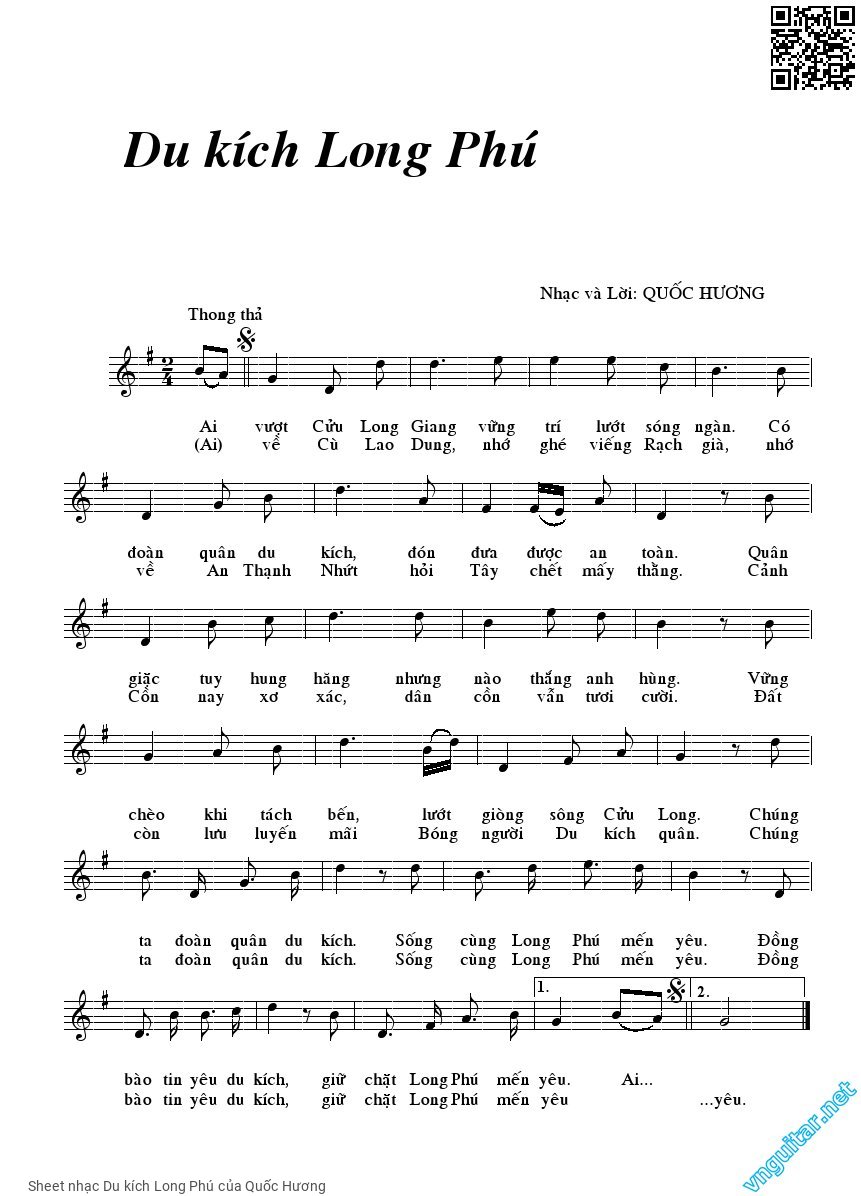 Chọn nút dấu + để tăng tông lên nửa cung, nút dấu - để giảm tông xuống nửa cung. Rê chuột vào hợp âm để xem các thế bấm hợp âm của bài hát Du kích Long Phú.