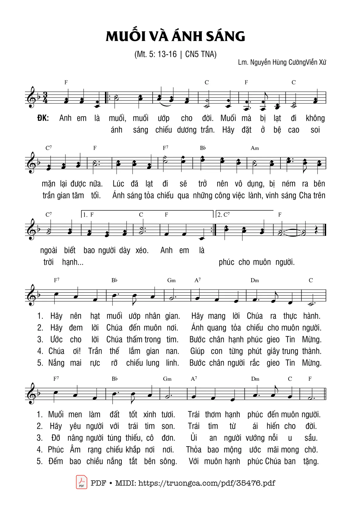 Điệp khúc: Anh em là muối, muối ướp cho đời. Muối mà bị lạt đi không mặn lại được nữa. Lúc đã lạt đi sẽ trở nên vô dụng, bị ném ra bên ngoài biết bao người dày xéo. Anh em là ánh sáng chiếu dương trần. Hãy đặt ở bệ cao soi trần gian tăm tối. Ánh sáng tỏa chiếu qua những công việc lành, vinh sáng Cha trên trời hạnh phúc cho muôn người.