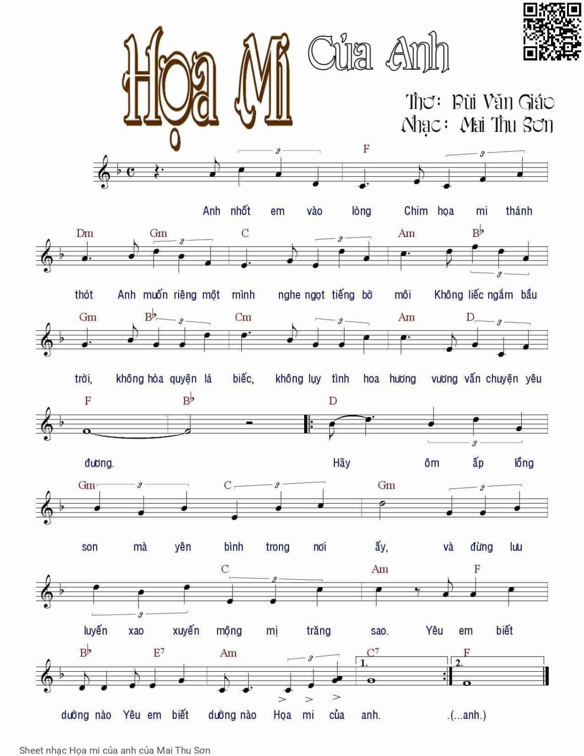 Mai Thu Sơn Anh nhốt em vào lồng Chim họa mi thánh thót [PDF] [Sheet] [Lời H.A] [Mp4/Midi]
