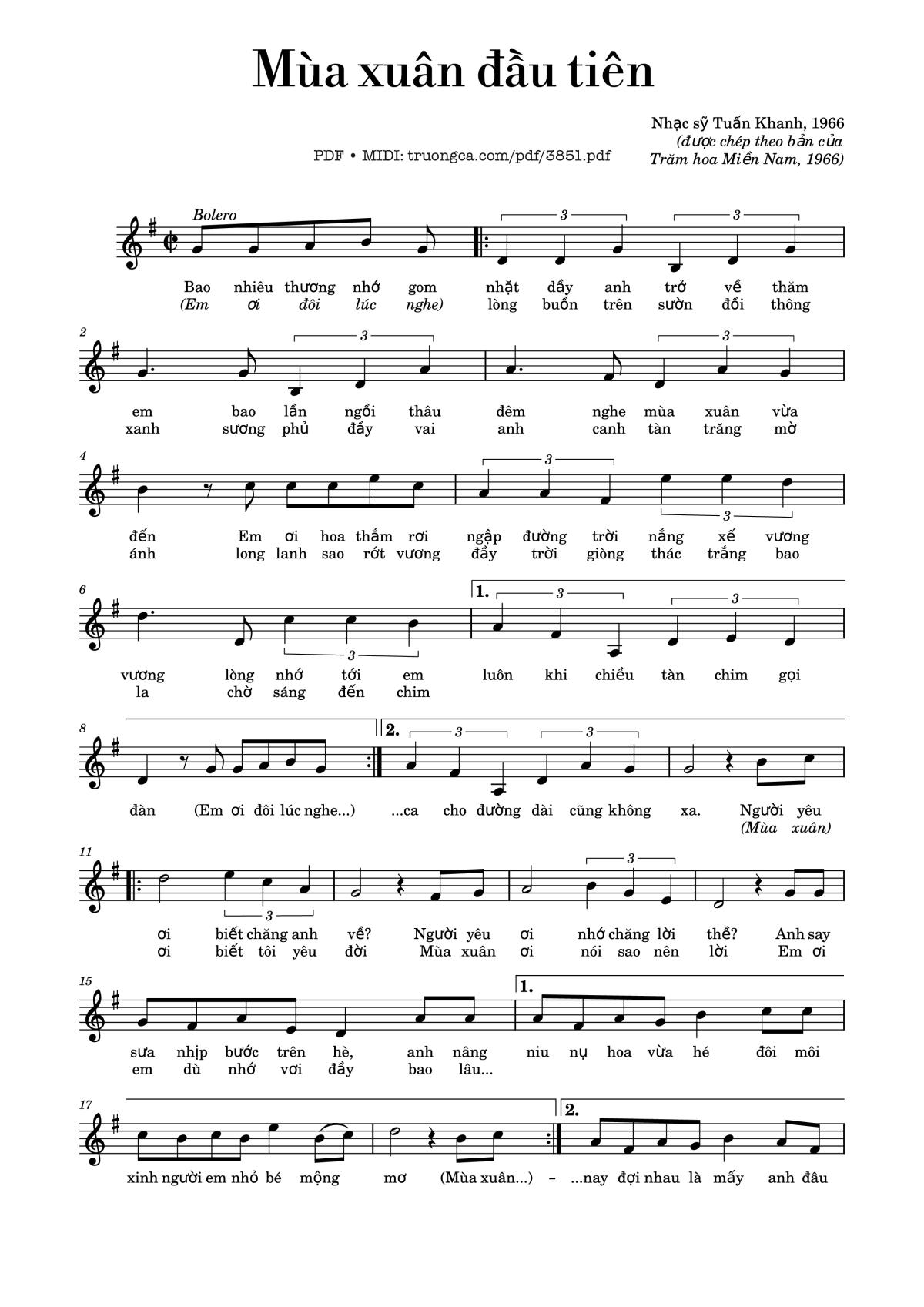 Chọn nút dấu + để tăng tông lên nửa cung, nút dấu - để giảm tông xuống nửa cung. Rê chuột vào hợp âm để xem các thế bấm hợp âm của bài hát Mùa xuân đầu tiên.