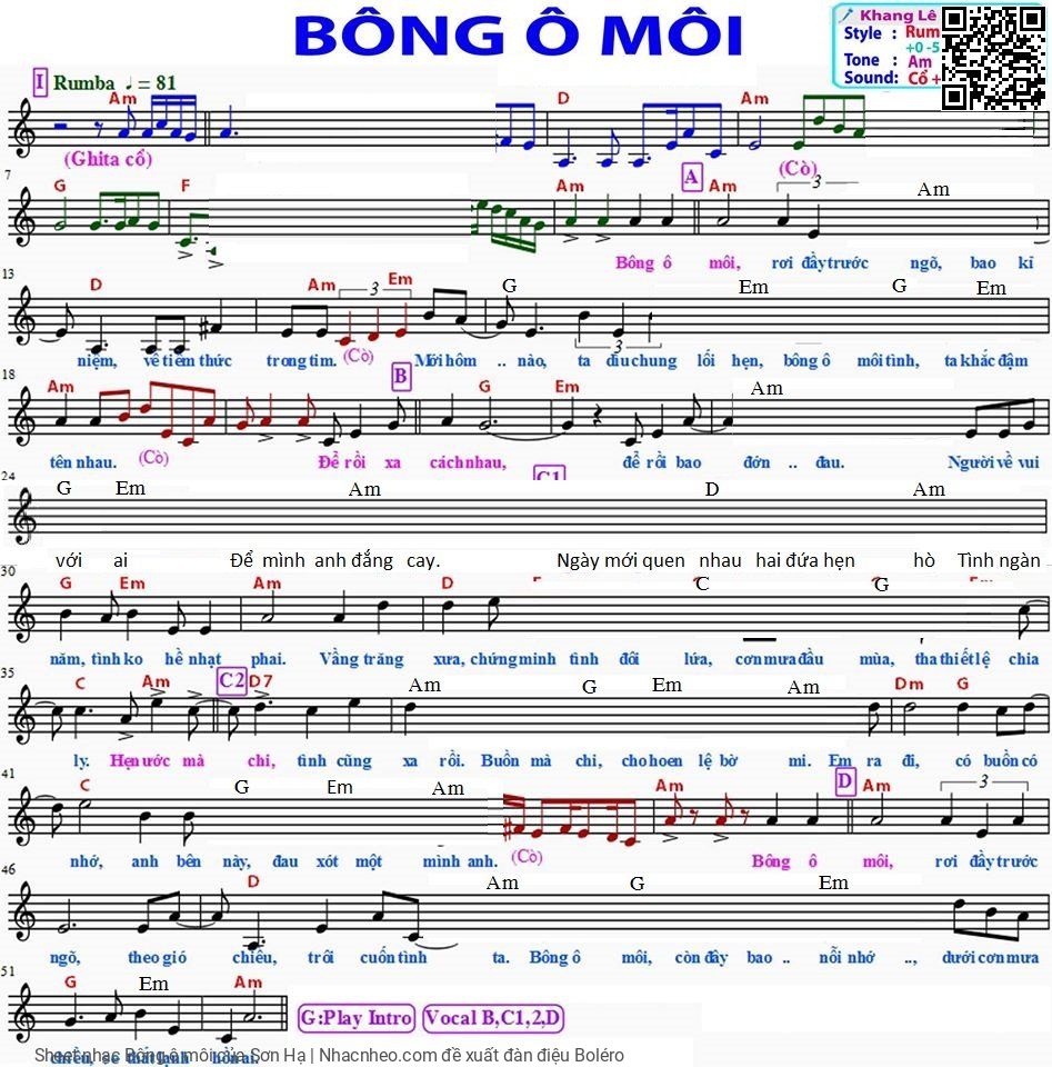 Chọn nút dấu + để tăng tông lên nửa cung, nút dấu - để giảm tông xuống nửa cung. Rê chuột vào hợp âm để xem các thế bấm hợp âm của bài hát Bông ô môi.