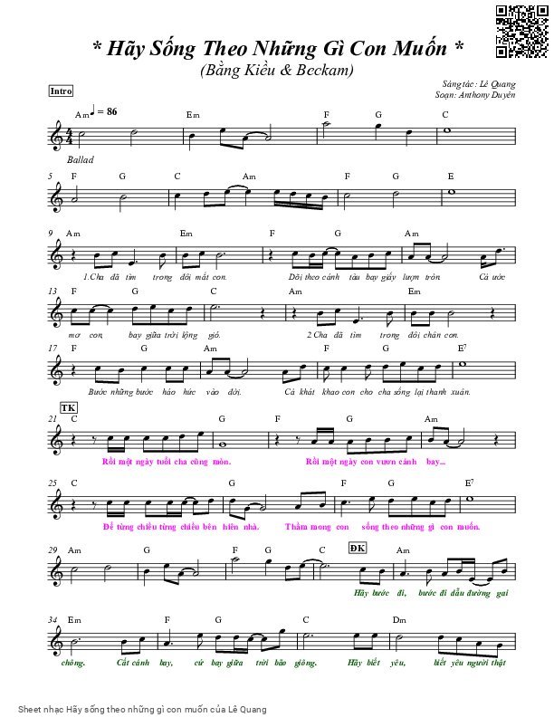 Chọn nút dấu + để tăng tông lên nửa cung, nút dấu - để giảm tông xuống nửa cung. Rê chuột vào hợp âm để xem các thế bấm hợp âm của bài hát Hãy sống theo những gì con muốn.