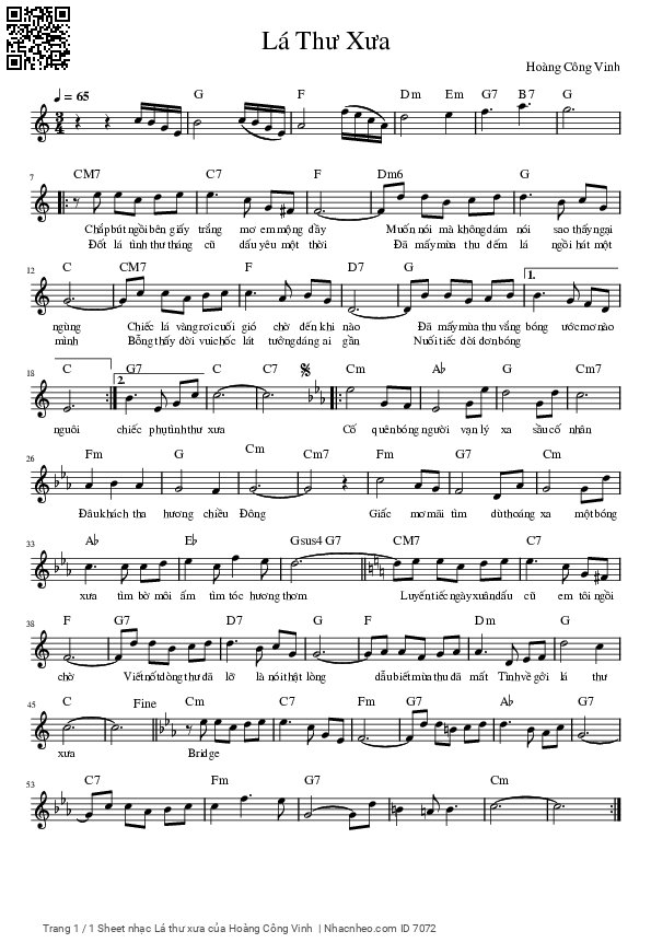 Chọn nút dấu + để tăng tông lên nửa cung, nút dấu - để giảm tông xuống nửa cung. Rê chuột vào hợp âm để xem các thế bấm hợp âm của bài hát Lá thư xưa.